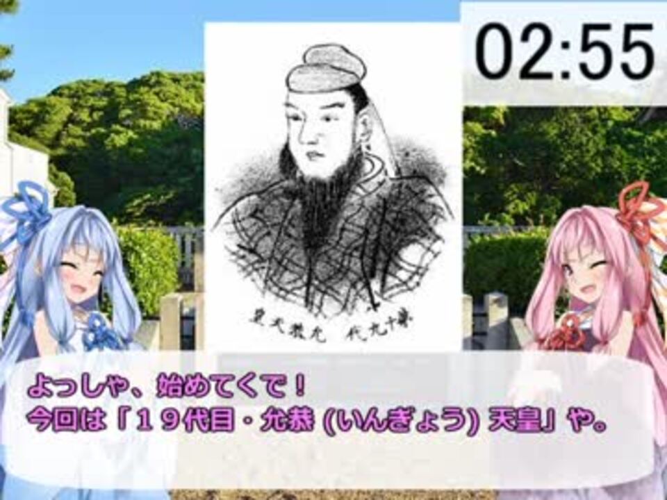 本年は私にとって飛躍の1年となりました。本当に応援ありがとうございました!<br>ローマ解説シリーズともども本シリーズを今後ともよろしくお願いいたします。<br><span style="color: #ff0000;"><strong>(平成中はローマ解説シリーズを優先して作成しますので更新が遅れると思います。ご了承ください。)</strong></span><br><br>●允恭 (いんぎょう)天皇 基本プロフィール <br> 父 仁徳天皇 (第四皇子) 母 磐之媛命<strong> </strong>(葛城襲津彦娘) <br> 在位 412年?~ 453年? (42年間?)<br> 生涯 376年?~ 453年? (78歳?)<br><br>●1代目 神武天皇 → <a href="https://www.nicovideo.jp/watch/sm33459779" class="watch">sm33459779</a> <br> 18代目 反正天皇 → <a href="https://www.nicovideo.jp/watch/sm34354095" class="watch">sm34354095</a> 20代目 安康天皇 → <a href="https://www.nicovideo.jp/watch/sm34619831" class="watch">sm34619831</a><br>●3分天皇紹介リスト → <a href="https://www.nicovideo.jp/mylist/62530271" target="_blank" rel="noopener">mylist/62530271</a> ついったー @inocchi_0515