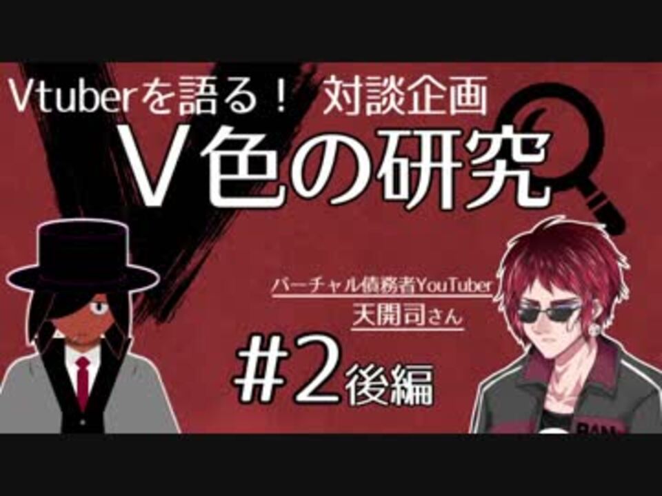 やあ、バーチャル名探偵の佐藤ホームズだ。<br>前回に引き続き、天開司さんとバーチャルYouTuberについて語り合ったぞ!<br><font color="#cc0000">前回:#2前編→<a href="https://www.nicovideo.jp/watch/sm34327043" class="watch">sm34327043</a></font><br><br><br>第2回ゲスト:天開司さん(バーチャル債務者YouTuber)<br>Twitter:<a href="https://twitter.com/tenkaitukasa" target="_blank" rel="noopener nofollow">https://twitter.com/tenkaitukasa</a><br>YouTube:<a href="https://www.youtube.com/channel/UCZYyhgoV314CM14zBD6vd4A" target="_blank" rel="noopener nofollow">https://www.youtube.com/channel/UCZYyhgoV314CM14zBD6vd4A</a><br><br>対談企画「V色の研究」マイリスト><a href="https://www.nicovideo.jp/mylist/63759010" target="_blank" rel="noopener">mylist/63759010</a><br><br>チャンネル登録をよろしく頼む!<br>助手の意見や感想も聞かせてほしいぞ! コメント待ってるよ! <br>→<a href="https://www.youtube.com/channel/UCOXumOju1oSdyHysRfnQAmA" target="_blank" rel="noopener nofollow">https://www.youtube.com/channel/UCOXumOju1oSdyHysRfnQAmA</a><br><br>Twitter:<br><a href="https://twitter.com/satouholmes" target="_blank" rel="noopener nofollow">https://twitter.com/satouholmes</a><br><br>質問箱(大体なんでも回答):<br><a href="https://peing.net/ja/satouholmes" target="_blank" rel="noopener nofollow">https://peing.net/ja/satouholmes</a><br><br><br>考察シリーズマイリスト> <a href="https://www.nicovideo.jp/mylist/63032703" target="_blank" rel="noopener">mylist/63032703</a><br><br>3分でわかる!シリーズマイリスト><a href="https://www.nicovideo.jp/mylist/62367529" target="_blank" rel="noopener">mylist/62367529</a><br><br>名探偵のVtuberおすすめセットその1><a href="https://www.nicovideo.jp/watch/sm33528513" class="watch">sm33528513</a>
