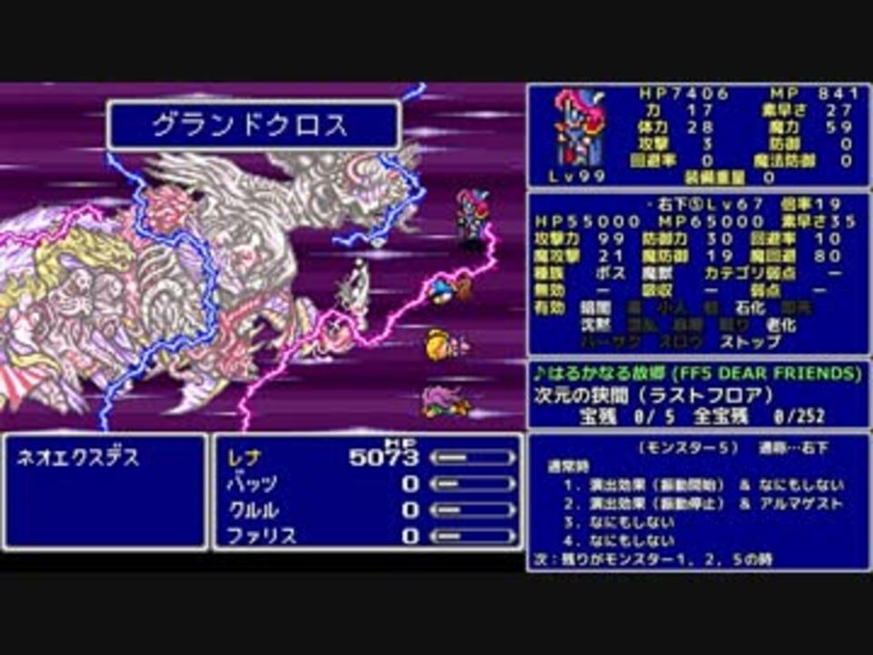 この世に光ある限り!俺は何度でもよみがえる!!!<br><br>★縛り内容★<br>魔法のみ(白黒時召青)<br>全裸<br>魔法以外の行動不可<br>魔法を使えるジョブのみ<br>アクティブスピード1<br>宝箱回収率100%<br>アイテムの使用は移動中のセーブ可能な場所でのみ<br>勝率0%確定したら最小限のその時だけの解放を考えて続行する<br>ボスを即死等であっさり倒したら使わない戦闘も頑張る<br><br>FF5一覧…<a href="https://www.nicovideo.jp/mylist/56239646" target="_blank" rel="noopener">mylist/56239646</a><br><br>字幕のみPart68…<a href="https://youtu.be/PbPne33lR5o" target="_blank" rel="noopener nofollow">https://youtu.be/PbPne33lR5o</a><br><br>○前回○ Part67…<a href="https://www.nicovideo.jp/watch/sm34276507" class="watch">sm34276507</a><br>○次回○ Part69…<a href="https://www.nicovideo.jp/watch/sm34407025" class="watch">sm34407025</a><br>○検証○ Part70…<a href="https://www.nicovideo.jp/watch/sm34413650" class="watch">sm34413650</a><br><br>Youtube版 … <a href="https://youtu.be/I_7ig5KiYBI" target="_blank" rel="noopener nofollow">https://youtu.be/I_7ig5KiYBI</a><br /><br>ふよふよしているの<br>絵:横沢さわらさん VOICEVOX:WhiteCUL<br><br>【シリーズ】<br>くうねるきゃんぷ … <a href="https://www.nicovideo.jp/series/516069" target="_blank" rel="noopener">series/516069</a><br>お写んぽ! … <a href="https://www.nicovideo.jp/series/435756" target="_blank" rel="noopener">series/435756</a><br>様子がおかしい! … <a href="https://www.nicovideo.jp/series/418875" target="_blank" rel="noopener">series/418875</a><br>FF7 魔法マテリアのみ初期防具ガールズ一人旅ASM … <a href="https://www.nicovideo.jp/series/438696" target="_blank" rel="noopener">series/438696</a><br>きんかつ!V-STROM1050XT … <a href="https://www.nicovideo.jp/series/144466" target="_blank" rel="noopener">series/144466</a><br>FF6 魔法のみ全裸ガールズ一人旅AS1 … <a href="https://www.nicovideo.jp/series/9438" target="_blank" rel="noopener">series/9438</a><br>おバイク!GLADIUS400 ABS … <a href="https://www.nicovideo.jp/series/68579" target="_blank" rel="noopener">series/68579</a><br>FF5 魔法のみ全裸一人旅AS1 … <a href="https://www.nicovideo.jp/series/9432" target="_blank" rel="noopener">series/9432</a><br>DQ3 呪文のみ全裸一人旅 … <a href="https://www.nicovideo.jp/series/9416" target="_blank" rel="noopener">series/9416</a><br>DQ2 ムーンブルクの王女一人旅 … <a href="https://www.nicovideo.jp/series/9414" target="_blank" rel="noopener">series/9414</a><br>DQ1 全裸 … <a href="https://www.nicovideo.jp/series/9412" target="_blank" rel="noopener">series/9412</a><br>FE 紋章の謎 天馬騎士単騎 第2部 英雄戦争 … <a href="https://www.nicovideo.jp/series/9404" target="_blank" rel="noopener">series/9404</a><br>FE 紋章の謎 天馬騎士単騎 第1部 暗黒戦争 … <a href="https://www.nicovideo.jp/series/9401" target="_blank" rel="noopener">series/9401</a><br>聖剣2 全裸プリム一人旅 武器Lv1など … <a href="https://www.nicovideo.jp/series/9396" target="_blank" rel="noopener">series/9396</a><br>ロマサガ2 魔術士不得意武器のみ … <a href="https://www.nicovideo.jp/series/9388" target="_blank" rel="noopener">series/9388</a><br>ロマサガ1 術法のみ一人旅で各イベント攻略 … <a href="https://www.nicovideo.jp/series/9386" target="_blank" rel="noopener">series/9386</a><br><br>SNSとか色々なリンク … <a href="https://lit.link/Unaa" target="_blank" rel="noopener nofollow">https://lit.link/Unaa</a>