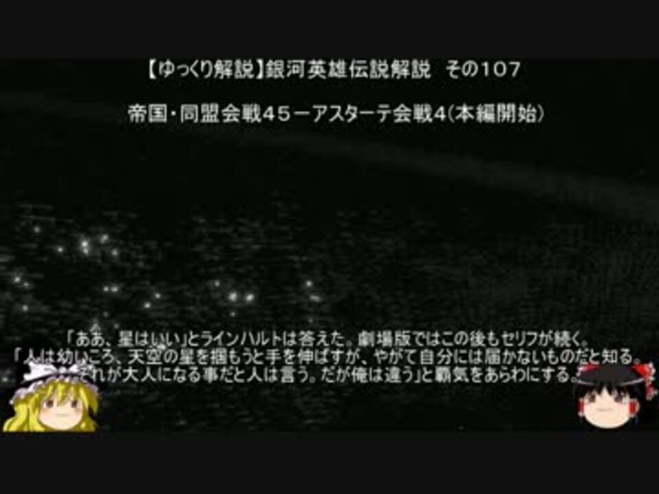 --- 以下外伝最終 ----<br>宇宙暦795年/帝国暦486年10月の終わりごろ、帝国軍による侵攻計画を知った同盟政府は対策を迫られる。<br>敵の戦力は帝国軍上級大将のローエングラム伯を総司令官とする艦艇2万隻であった。<br>同盟政府の国防委員会委員長のヨブ・トリューニヒトは、統合作戦本部長のシドニー・シトレ元帥に迎撃を指令する。<br>トリューニヒトによれば、敵の戦力は2万隻であるから、倍の4万隻、3個艦隊で充分だろうと言う事であった。<br>迎撃のために選ばれた3個艦隊は、パエッタ中将の第2艦隊1万5千隻、パストーレ中将の第2艦隊1万2千隻、<br>ムーア中将の第6艦隊1万3千隻であった。パストーレ中将とムーア中将の起用については、ロボス元帥の意向が働いたと言われる。<br>翌宇宙暦796年/帝国暦487年1月中旬ごろ、三艦隊の分進合撃を基本戦術として、アスターテ星域に布陣をして<br>帝国軍を待ち受ける形をとる。なお第2艦隊にはヤン准将、第6艦隊にはラップ少佐が配属されていた。<br>一方帝国軍はローエングラム伯を総司令官として5人の提督を従えて2万隻の戦力をもって同盟領に侵攻する。<br>帝国軍は途中イゼルローン要塞で補給と整備を挟み、翌宇宙暦796年/帝国暦487年2月初旬にアスターテ星系外縁部に達する。<br>--- 以下本編 ----<br>旗艦艦橋の司令官シートでスクリーンを眺めていたラインハルトに対して、<br>キルヒアイスが「星を見ておいでですか?」と声をかける。<br>「ああ、星はいい…それで要件は?」とラインハルトは返答する。キルヒアイスは同盟軍が、わが方の倍の4万隻で、<br>三方から包囲せんとしている状況を慮り、麾下の5人の提督が至急に会見を求めている事を告げる。<br>キルヒアイスが「お会いになりませんか?」と言うと、「会ってやるさ、彼らの蒙を開くために」と答えるラインハルトであった。<br><br>第001話 <a href="https://www.nicovideo.jp/watch/sm33175734" class="watch">sm33175734</a><br>第108話 <a href="https://www.nicovideo.jp/watch/sm34416916" class="watch">sm34416916</a><br>第106話 <a href="https://www.nicovideo.jp/watch/sm34407587" class="watch">sm34407587</a><br><br>マイリスト <a href="https://www.nicovideo.jp/mylist/12818453" target="_blank" rel="noopener">mylist/12818453</a><br>コミュニティ co3805222<br><br>