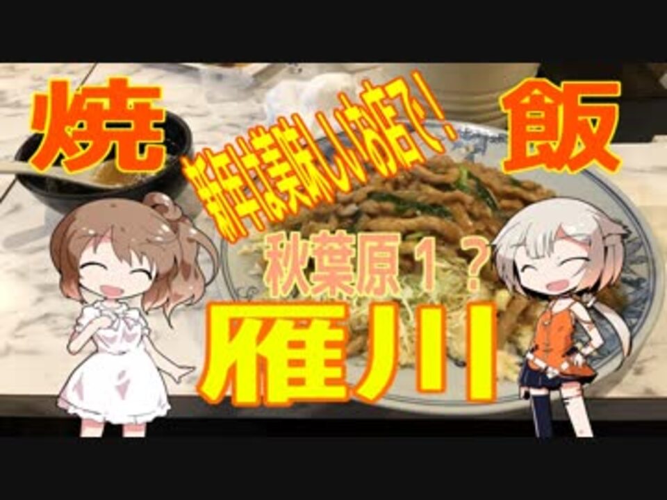 みなさん、おはようございます。<br><br>今回は、私の好きな街「<b>秋葉原</b>」にあるお店、<br>中華料理屋「<b>雁川</b>」の紹介になります。<br>俗に言う、秋葉飯ってやつですね><b<br><br>雁川は、私の中では・・・秋葉原1炒飯の美味しいお店です。<br>量も、並、大、トリプルと、これでもかというぐらい<br>量を楽しむことができます><b<br>なお、麺系でも同じように量を選べる種類もありますが<br>「<b>豚しゃぶつけ麺</b>」のトリプルは・・・やばいぞ。<br>美味しいけど、量が冗談無くはんぱないぞっ!<br><br>秋葉原に行ったら、是非1度は行ってみてほしいお店です。<br><b>オススメです!<br></b><br><b><前回のレビュー></b><br>前回⇒パンを食べたら止まらなくなる予定のお話:<a href="https://www.nicovideo.jp/watch/sm34190240" class="watch">sm34190240</a><br>次回⇒全国展開している焼肉バイキング・・・のランチバイキングのお話(予定)<br><<b>過去の食レポ動画</b>><br><a href="https://www.nicovideo.jp/mylist/63282123" target="_blank" rel="noopener">mylist/63282123</a> <br><br><使用絵><b> はるか</b>様より、お借りしています。 <br><デフォルメささら><a href="https://seiga.nicovideo.jp/seiga/im6111040" target="_blank" rel="noopener">im6111040</a> <br><デフォルメONE><a href="https://seiga.nicovideo.jp/seiga/im6140267" target="_blank" rel="noopener">im6140267</a> <br><br><CV>ONE & IA