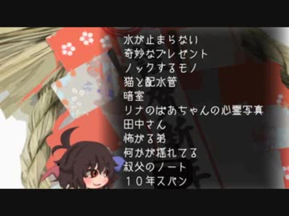 明けましておめでとうございますm(_ _)m<br>今年もゆっくりよろしくお願い致しますm(_ _)m<br><br>水が止まらない/ 奇妙なプレゼント/ ノックするモノ/ 猫と配水管/ 暗室/ リナのばあちゃんの心霊写真/ 田中さん/ 怖がる弟/ 何かが揺れてる/ 叔父のノート/ 10年スパン<br><br>BGM は H/MIX GALLERY様からお借りしました<br>HP → <a href="http://www.hmix.net/" target="_blank" rel="noopener nofollow">http://www.hmix.net/</a><br><br>背景は 足成様からお借りしました<br>HP → <a href="http://www.ashinari.com/" target="_blank" rel="noopener nofollow">http://www.ashinari.com/</a><br><br>次の動画に自動的に移動します<br><br>次話→<a href="https://www.nicovideo.jp/watch/sm34564357" class="watch">sm34564357</a><br>前話→<a href="https://www.nicovideo.jp/watch/sm34309798" class="watch">sm34309798</a><br><br>1話→<a href="https://www.nicovideo.jp/watch/sm20857945" class="watch">sm20857945</a><br><br><a href="https://www.nicovideo.jp/mylist/37109662" target="_blank" rel="noopener">mylist/37109662</a><br><br><br>山怖<br><a href="https://www.nicovideo.jp/mylist/36623261" target="_blank" rel="noopener">mylist/36623261</a><br><br>シリーズ<br><a href="https://www.nicovideo.jp/mylist/44947135" target="_blank" rel="noopener">mylist/44947135</a><br><br>一口<br><a href="https://www.nicovideo.jp/mylist/47244966" target="_blank" rel="noopener">mylist/47244966</a><br><br>きみ 様、ガガンボ様、 くじら様、 yukit様、 yoshikichi様、 雨雲蛇様、beat様、玉兎様、 竜嘉様、 <br>猫ノ仔様、 SYU様、 射月様、 ノレン様、SOBA様、 饂飩より様、つぴつぴ様、まおうちゃん様、<br>あかめろ様、ペンギン様、きいえ様、げじ様、Mono Eye様、魑魅魍魎 様、きよまる様、Hezro様、<br>鶏皿様、 テツ様、 E.A.Crowley様、(´・ω・`)様、TTT様、おふとん様、ネコ様、ささもん様、<br>バラライカ様、yu2様、mayu様、リコピン様、雪車町地蔵様、オリノ様、<span style="color: #000000; font-size: 13px;">ヨッシー様</span> 広告ありがとうございますm(_ _)m <br>