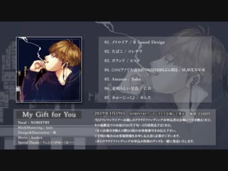明けましておめでとうございます、本年もよろしくお願いします。<br>そして、クラウドファンディングのアルバムクロスフェードです。<br>今の等身大の僕が詰まった一枚です、どうぞよしなに…!<br><br>===================<br><br>▶▶Track list▶▶<br>☆01.メトロイア / R Sound Design<br> 02.たばこ / コレサワ<br> 03.ガランド / ピコン<br> 04.このピアノでお前を8759632145回ぶん殴る / SLAVE.V-V-R<br>☆05.Amaoto / Saku<br>☆06.素晴らしい景色 / にお<br> 07.みゅーじっく♪ / みんた<br> (☆書下ろし曲)<br>===================<br><br>▶▶Credit▶▶ <br>MIX&MASTER :kain(<a href="https://www.nicovideo.jp/mylist/27370276" target="_blank" rel="noopener">mylist/27370276</a>) <a href="https://twitter.com/kain2525" target="_blank" rel="noopener nofollow">https://twitter.com/kain2525</a><br>ILLUST :鈴 <a href="https://twitter.com/_gongonbe_" target="_blank" rel="noopener nofollow">https://twitter.com/_gongonbe_</a><br>MOVIE :kenken(<a href="https://www.nicovideo.jp/mylist/36137794" target="_blank" rel="noopener">mylist/36137794</a>)<a href="https://twitter.com/kenkenppp" target="_blank" rel="noopener nofollow">https://twitter.com/kenkenppp</a><br>VOCAL :NORISTRY(<a href="https://www.nicovideo.jp/mylist/31730762" target="_blank" rel="noopener">mylist/31730762</a>) <a href="https://twitter.com/NORISTRY2525" target="_blank" rel="noopener nofollow">https://twitter.com/NORISTRY2525</a><br><br>その他詳細は動画にて…<br><br>===================<br><br><font color="#cc0000" size="3"><b>【ワンマンライブ開催決定】</b></font><br>2019/01/19(土)初台Doors<br><a href="https://passmarket.yahoo.co.jp/event/show/detail/01jbxyzv57x5.html" target="_blank" rel="noopener nofollow">https://passmarket.yahoo.co.jp/event/show/detail/01jbxyzv57x5.html</a>