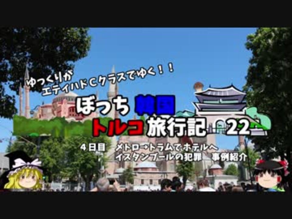 <font color="#ff0000" size="4"><u>※Youtubeで1話分、先行配信中 </u></font><br><font color="#0000ff" size="4"> <a href="http://www.youtube.com/c/なめこのぼっち旅" target="_blank" rel="noopener nofollow">http://www.youtube.com/c/なめこのぼっち旅</a></font> <br><br><b> </b>あけましておめでとうございます!<br>2019年もよろしくお願いいたします。<br><br>リアルタイムでは、鹿児島車中泊旅行から帰ってきました。<br>一人で12時間 800km走るの疲れましたわ・・・。<br><br>第1話→<a href="https://www.nicovideo.jp/watch/sm34047420" class="watch">sm34047420</a><br><br>第1章・・・韓国観光編<br> 第2章・・・出発編<br> 第3章・・・トルコ観光編<font color="#ff0000">←今ココ</font><br> 第4章・・・帰路編<br><br><font color="#ff0000">コミュニティー→co2910020</font><br> twitter→<a href="https://twitter.com/ryontan" target="_blank" rel="noopener nofollow">https://twitter.com/ryontan</a><br><br><a href="https://www.nicovideo.jp/watch/sm34402723" class="watch">sm34402723</a>←前回 <font color="#ff0000">次回 23話→<a href="https://www.nicovideo.jp/watch/sm34449864" class="watch">sm34449864</a></font><br><br>解説・雑談系→<a href="https://www.nicovideo.jp/mylist/63171869" target="_blank" rel="noopener">mylist/63171869</a><br>今作 韓国トルコ旅行記→<a href="https://www.nicovideo.jp/mylist/63654428" target="_blank" rel="noopener">mylist/63654428</a><br>今作 車中泊旅行記→<a href="https://www.nicovideo.jp/mylist/54706524" target="_blank" rel="noopener">mylist/54706524</a><br>前作 久米島(沖縄)旅行記→<a href="https://www.nicovideo.jp/mylist/63059251" target="_blank" rel="noopener">mylist/63059251</a><br><b></b>イギリスタイ旅行記→<a href="https://www.nicovideo.jp/mylist/60044833" target="_blank" rel="noopener">mylist/60044833</a><br>クルーズ旅行記→<a href="https://www.nicovideo.jp/mylist/57397685" target="_blank" rel="noopener">mylist/57397685</a><br>ドイツ周遊記→<a href="https://www.nicovideo.jp/mylist/54938346" target="_blank" rel="noopener">mylist/54938346</a><br>北海道旅行記→<a href="https://www.nicovideo.jp/mylist/52618057" target="_blank" rel="noopener">mylist/52618057</a><br>アメリカ横断記→<a href="https://www.nicovideo.jp/mylist/48621785" target="_blank" rel="noopener">mylist/48621785</a><br>イタリア周遊記→<a href="https://www.nicovideo.jp/mylist/45763559" target="_blank" rel="noopener">mylist/45763559</a><br>NY旅行記→<a href="https://www.nicovideo.jp/mylist/44343854" target="_blank" rel="noopener">mylist/44343854</a><font color="#ff0000" size="5"><font color="#000000" size="2"><br></font></font>