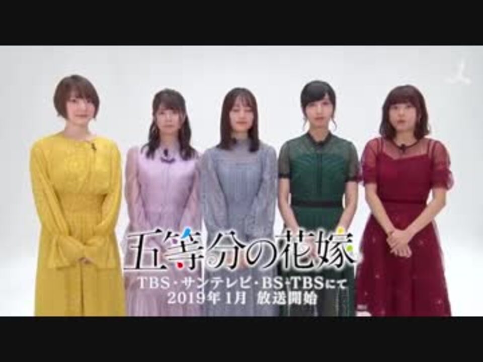 ヒロインは五つ子!? 未来の花嫁は一人だけ─<br>累計150万部を突破した「週刊少年マガジン」(講談社)で連載中の大人気ラブコメディが、TVアニメ化決定! <br><br>【放送情報】<br>TBS 1月10日(木)深夜1時28分スタート<br>サンテレビ 1月11日(金)深夜0時スタート<br>BS-TBS 1月12日(土)深夜2時スタート<br>※放送時間は変更になる可能性があります。<br><br>【あらすじ】<br>貧乏な生活を送る高校2年生・上杉風太郎のもとに、好条件の家庭教師アルバイトの話が舞い込む。<br>ところが教え子はなんと同級生!! しかも五つ子だった!! 個性豊かな中野家の五つ子は全員美少女、 だけど「落第寸前」「勉強嫌い」の問題児! 最初の課題は彼女たちからの信頼を勝ち取ること・・・!? <br>毎日がお祭り騒ぎ! 中野家の五つ子が贈る、かわいさ500%の五人五色ラブコメ開演!!<br><br>【スタッフ】<br>原作 春場ねぎ『五等分の花嫁』(講談社「週刊少年マガジン」連載中)<br>監督 桑原 智<br>シリーズ構成 大知慶一郎<br>キャラクターデザイン 中村路之将 雅楽雅<br>プロップデザイン 荻野美希 川石テツヤ<br>美術監督 斉藤雅己<br>色彩設計 油谷ゆみ<br>撮影監督 染谷和正(T2スタジオ)<br>編集 内田 渉(コンクエスト)<br>音響監督 平光琢也<br>音楽 田渕夏海 中村巴奈重 櫻井美希<br>アニメーション制作 手塚プロダクション<br><br>【音楽】<br>オープニングテーマ:「五等分の気持ち」<br>中野家の五つ子(花澤香菜・竹達彩奈・伊藤美来・佐倉綾音・水瀬いのり)<br><br>エンディングテーマ:「Sign」<br>内田 彩<br> <br><a href="http://www.tbs.co.jp/anime/5hanayome/" target="_blank" rel="noopener nofollow">http://www.tbs.co.jp/anime/5hanayome/</a><br>@5Hanayome_anime