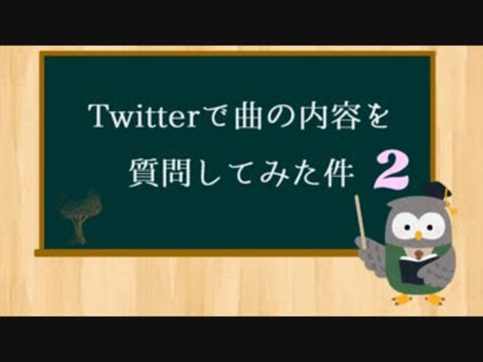 <font color="#ff9900"><b>もう一度twitterで曲の内容を質問してみたらこうなりました。</b></font><br><br>10曲目です。あ子です。 <br><br>※動画内で19番目の表記が誤って「フウロウ」となっておりました。<br>正しくは「フクロウ」です。大変申し訳ございませんでした。<br><br><font size="1">2018年10月末頃に<br> ①曲の中で使う効果音(4択から2つ)<br> ②2番のあとにあるソロで使っちゃダメな楽器(4択)<br> ③歌詞に使う言葉(リプライで募集)<br>の3つをTwitterでアンケートしました。<br> →詳細は<font color="#000020"> #Twitterで曲の内容を質問してみた件 </font>からご覧ください!<br><br>歌詞については、<u><font color="#ff0000">いただいた単語すべて(40個)</font></u>を曲中に登場させております!<br>どのような結果になったのか、楽しんでいただけたら嬉しいです(<font color="#ff00ff">*</font>'ω'<font color="#ff00ff">*</font>)</font><br><br>ご協力いただいた皆さま、本当<font color="#262626" size="2">に本当に</font><font size="4"><b>あ</b>りがとうございました!!</font><br><br>歌詞はこちら <font><a href="https://piapro.jp/t/y5Zb" target="_blank" rel="noopener nofollow">https://piapro.jp/t/y5Zb</a></font><br><br>曲・歌詞/あ子とフォロワーの皆さま <br>動画/あ子 <a href="https://www.nicovideo.jp/mylist/61769013" target="_blank" rel="noopener">mylist/61769013</a>( <a href="https://twitter.com/ako_okko" target="_blank" rel="noopener nofollow">https://twitter.com/ako_okko</a> )<br><br>「PIANO SOLO」のフォントは はとさん ( <a href="https://twitter.com/HATO_FONT" target="_blank" rel="noopener nofollow">https://twitter.com/HATO_FONT</a> )からお借りしました! <br><br>前作:赤とシアン <a href="https://www.nicovideo.jp/watch/sm34302672" class="watch">sm34302672</a><br>