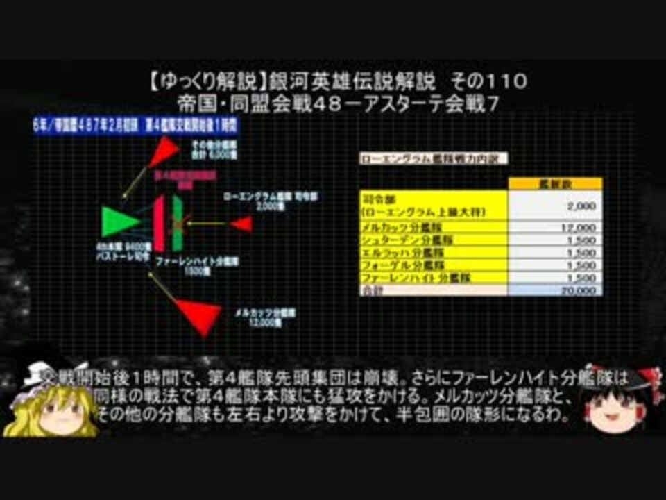 宇宙暦796年/帝国暦487年2月初旬、帝国軍ローエングラム艦隊2万隻と、<br>同盟軍第2、第4、第6艦隊合計4万隻がアスターテ星域に集結して、アスターテ会戦が始まった。<br>ローエングラム艦隊は、同盟軍首脳の予想に反して、三艦隊の内もっとも少数の第4艦隊を急襲する。<br>第4艦隊の司令パストーレ中将は、理由は不明だが、自分の艦隊が最初に攻撃を受けるはず無いと思い、<br>敵情偵察をほとんど行っていなかった。帝国軍がイエローゾーン(5光秒程度?)に迫ってきた段階で、<br>初めて敵が全力で第4艦隊を撃破する意図がある事を認識する。正面から奇襲を受ける形になった第4艦隊の<br>パストーレ司令は「敵は用兵を知らぬ」等と無意味な言葉を発して、狼狽するばかりだった。<br>結局第2、第4艦隊に連絡艇で援護を求める一方、総力戦を行う事を決断する。<br>しかし機先を制された上に、1万2千対2万では戦いの帰趨は知れていた。<br>ローエングラム艦隊はファーレンハイト分艦隊を先鋒に立てて、順調に第4艦隊を攻略して行った。<br>第4艦隊の苦境を知った、第2艦隊のパエッタ司令は次席幕僚のヤン准将に打開策を問う。<br>ヤンは第6艦隊との合流を優先するべきと説くが、それは第4艦隊の崩壊を前提としたもので、<br>パエッタ司令が受け入れられる案では無かった。<br><br>第001話 <a href="https://www.nicovideo.jp/watch/sm33175734" class="watch">sm33175734</a><br>第111話 <a href="https://www.nicovideo.jp/watch/sm34495132" class="watch">sm34495132</a><br>第109話 <a href="https://www.nicovideo.jp/watch/sm34455208" class="watch">sm34455208</a><br><br>マイリスト <a href="https://www.nicovideo.jp/mylist/12818453" target="_blank" rel="noopener">mylist/12818453</a><br>コミュニティ co3805222<br><br>