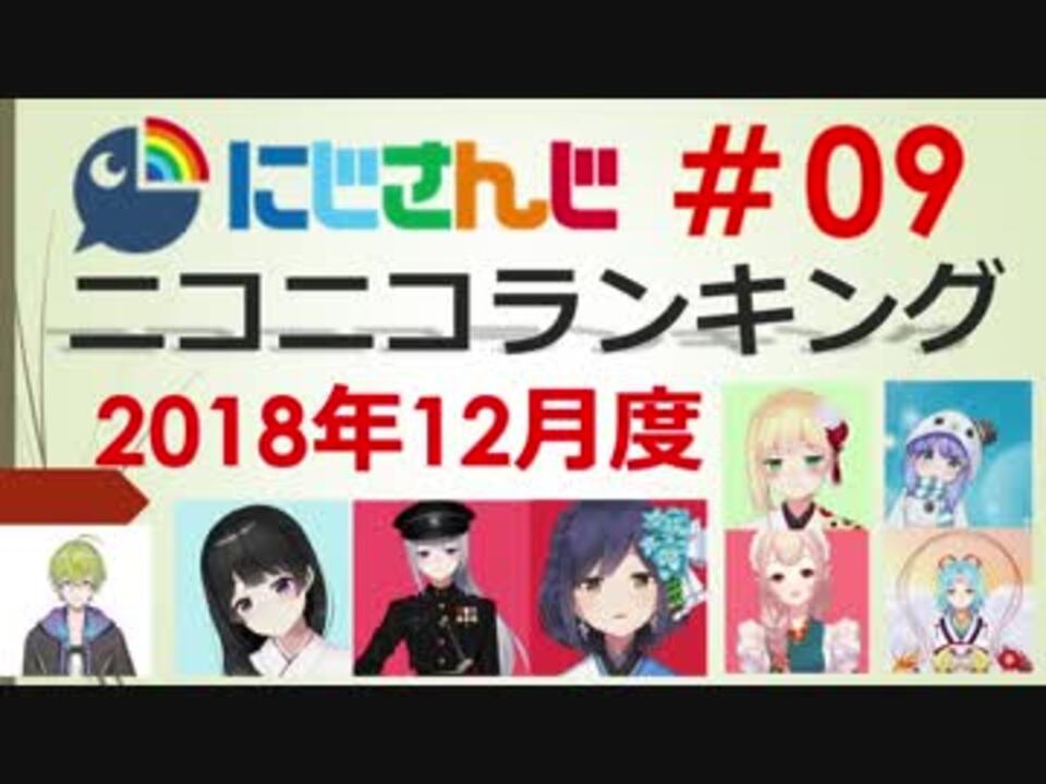■集計期間:2018年<font color="#ff0000" size="4">12</font><font color="#ff0000" size="4">月1日</font><font color="#262626" size="2">0時</font><font color="#262626" size="3">~</font><font color="#ff0000" size="4">12</font><font color="#ff0000" size="4">月31日</font><font size="2">24時</font><br>■集計方法:再生数+(コメント数×補正値)+(マイリスト登録数×<font color="#ff0000">25</font><font color="#262626">)</font><br>■集計対象:タグ 「にじさんじ」がついている動画<br>──────<br>プレイリスト:<a href="https://www.nicovideo.jp/mylist/64321853" target="_blank" rel="noopener">mylist/64321853</a><br>──────<br>#06 (9月度):<a href="https://www.nicovideo.jp/watch/sm33995984" class="watch">sm33995984</a>| #07 (10月度):<a href="https://www.nicovideo.jp/watch/sm34132305" class="watch">sm34132305</a> | <br>#08(11月度):<a href="https://www.nicovideo.jp/watch/sm34305609" class="watch">sm34305609</a> | #09(12月度):いまここ | #10(1月度):2月10日ごろ<br>年間ランキング:<a href="https://www.nicovideo.jp/watch/sm34419902" class="watch">sm34419902</a><br>──────<br><br>2018年12月度のランキングです。<br>約2万再生にも及ぶ年間ランキングの多くのご視聴ありがとうございました!<br>2019年もよろしくおねがいします。<br><br>今回より切り抜き除外判定を甘くしております。<br><font size="1">エンコード中に2人増えたでぇ…SEEDs登場の頃を思い出しますねぇ…</font>
