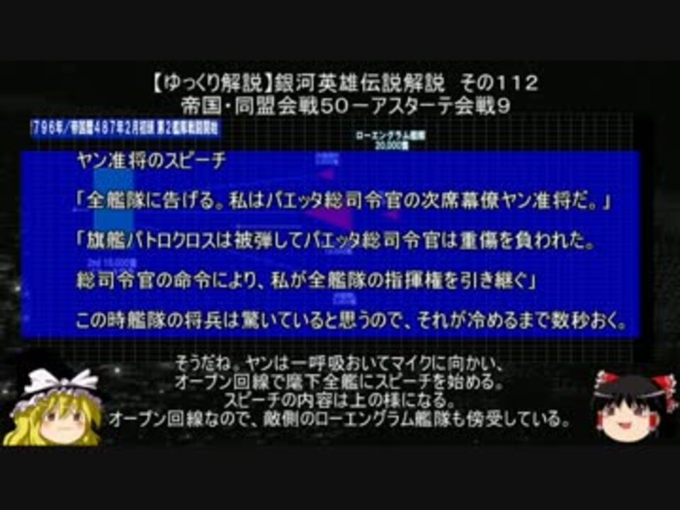 宇宙暦796年/帝国暦487年2月初旬、帝国軍ローエングラム艦隊は、まず第四艦隊を撃破して、<br>さらに第六艦隊も撃破した。第二艦隊は第四艦隊を救援に向かうが間に合わず、<br>さらに第六艦隊を救援に向かうがこれも間にあわなかった。<br>アスターテ星域に残る同盟軍は第二艦隊のみとなり、第二艦隊1万5千に対してローエングラム艦隊は二万と<br>総兵力でも劣勢となっていた。第六艦隊を破ったローエングラム艦隊は第二艦隊の撃破に向かう。<br>第二艦隊の方から見て一時二十分の方向で接触した両艦隊は戦闘を開始する。<br>二艦隊を撃破して意気上がるローエングラム艦隊に対して、既に二艦隊を失った第二艦隊は士気も上がらなった。<br>ローエングラム艦隊の砲撃は苛烈を極め、第二艦隊旗艦パトロクロスも被弾する。<br>ヤンは軽傷で済んだが、パエッタ司令は重傷を負った。さらに主だった幕僚もほとんど失った。<br>唯一参謀チームのラオ少佐が健在であった。パエッタ司令は、健在な士官の中で最高位と思われる、<br>ヤン准将に指揮権委譲の命令を出して気絶する。<br>指揮権を委譲されたヤン司令官代理には、予め戦術コンピュータに入力していた「秘策」があった。<br><br>第001話 <a href="https://www.nicovideo.jp/watch/sm33175734" class="watch">sm33175734</a><br>第113話 <a href="https://www.nicovideo.jp/watch/sm34565892" class="watch">sm34565892</a><br>第111話 <a href="https://www.nicovideo.jp/watch/sm34495132" class="watch">sm34495132</a><br><br>マイリスト <a href="https://www.nicovideo.jp/mylist/12818453" target="_blank" rel="noopener">mylist/12818453</a><br>コミュニティ co3805222<br><br>