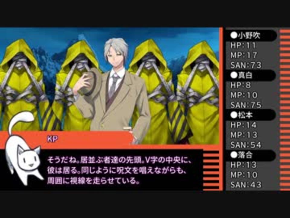 本作は、「 株式会社アークライト 」及び「株式会社KADOKAWA」が権利を有する『クトゥルフ神話TRPG』の二次創作物です。<br><br>Call of Cthulhu is copyright ©1981, 2015, 2019 by Chaosium Inc. ;all rights reserved. Arranged by Arclight Inc.<br>Call of Cthulhu is a registered trademark of Chaosium Inc.<br>PUBLISHED BY KADOKAWA CORPORATION 「クトゥルフ神話TRPG」<br><br>※当シナリオはシナリオ集「月下神話絵巻 三巻」に収録されています。<br><a href="https://colorcat.booth.pm/" target="_blank" rel="noopener nofollow">https://colorcat.booth.pm/</a><br><br>遅くなりました。<br><span style="font-size: 10px;">(長期人狼をやっていたという、わかりやすい理由)</span><br>かなり端折っているように見えますが、実プレイの時もかなり端折ってました。<br><br>魔術や神話生物、神話的事象には、一部オリジナル要素や独自解釈が含まれます。ご了承ください。<br><br>今回は青に染まる夜(<a href="https://www.nicovideo.jp/mylist/61046170" target="_blank" rel="noopener">mylist/61046170</a>)の続編的なセッションです。 <br>先にそちらを視聴することを強く推奨します。 <br>該当セッションを踏まえた話となりますので、ご了承ください。<br><br>身内卓を動画化しています。<br>ハウスルールましましで色々緩いですが、ご容赦ください。<br><br>また、継続探索者が登場します。<br>先に過去作品を見ていただいた方が、楽しんでいただけると思います。<br>過去作のネタバレも含みますので、何卒ご了承ください。<br>(関連作品:黒薔薇館の怪、共食、土に溺れる、赤の遺言、鬼猫犯科帳、白の囚人、青に染まる夜、探検は危険がいっぱい、軋む籠、ネオンのくすむ街 、閉じられた夢、陽の微笑み、影の嘆き、黒の共演、黄金色の旅路、山腹に眠る+大正編、過去編) <br><span style="font-size: 10px;">多くてすみません。</span> <br><br>広告して下さる皆さん、いつもありがとうございます。<br>まとめてのお礼となりまして恐縮ですが、今後とも頑張ります。<br><br>[クトゥルフ動画一覧]<a href="https://www.nicovideo.jp/mylist/60110794" target="_blank" rel="noopener">mylist/60110794</a><br>[part1動画一覧]<a href="https://www.nicovideo.jp/mylist/60289921" target="_blank" rel="noopener">mylist/60289921</a><br>[今作品mylist]<a href="https://www.nicovideo.jp/mylist/64300426" target="_blank" rel="noopener">mylist/64300426</a><br><br>[前]<a href="https://www.nicovideo.jp/watch/sm34494593" class="watch">sm34494593</a><br>[次]<a href="https://www.nicovideo.jp/watch/sm34535459" class="watch">sm34535459</a><br /><br>色猫卓ポータルサイト<br>→<a href="https://marchocias.xsrv.jp/colorcat/index.html" target="_blank" rel="noopener nofollow">https://marchocias.xsrv.jp/colorcat/index.html</a><br>動画で紹介しても良い支援絵は #いろねこあーと で!<br><br>ピッコマで小説連載開始しました!<br>魔族生まれの聖女様!? 著:黒猫ている<br><a href="https://piccoma.com/web/product/156938" target="_blank" rel="noopener nofollow">https://piccoma.com/web/product/156938</a>