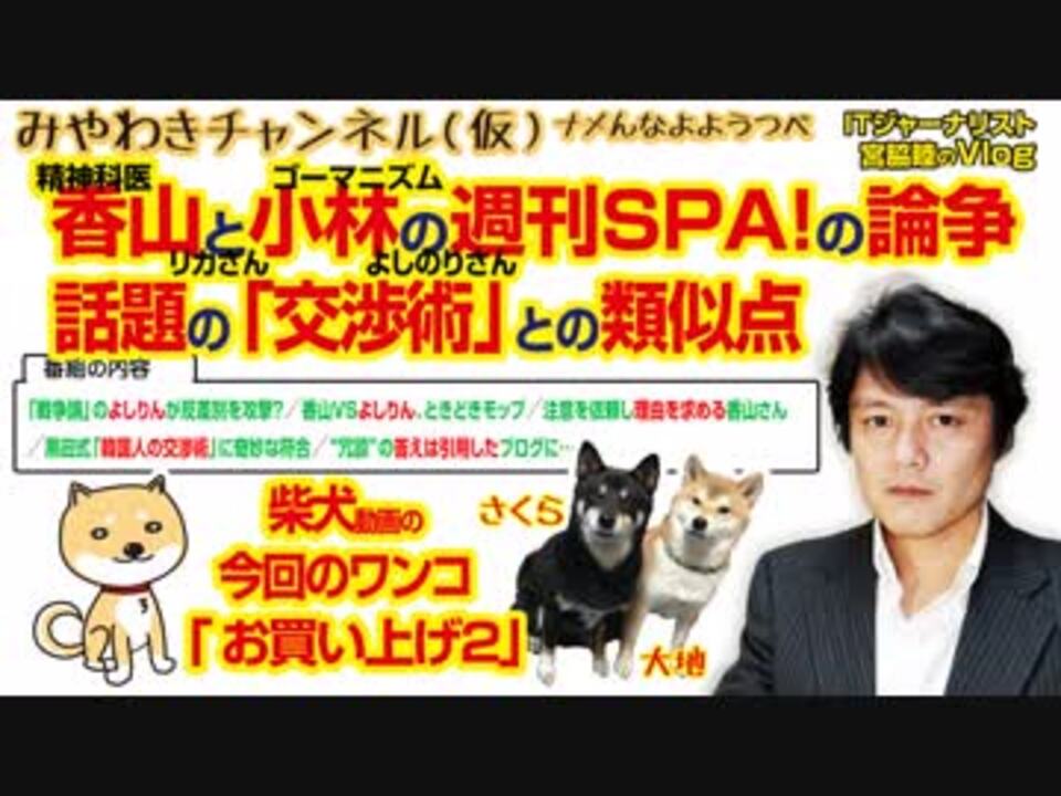 週刊SPA! ゴーマニズムよしりん先生VS香山さんの「論点ずらし」。話題の「交渉術」との類似点<br><br>番組内容<br>0:35 「戦争論」のよしりんが反差別を攻撃?<br>2:17 香山VSよしりん、ときどきモップ<br>7:00 注意を依頼し理由を求める香山さん<br>11:52 黒田式「韓国人の交渉術」に奇妙な符合<br>13:20 “冗談”の答えは引用したブログに…<br>17:22 今回のワンコ「お買い上げ2」<br><br>みやわきチャンネル(仮)#346Restart204<br>(旧・マスコミでは言えないこと)<br>オリジナル2019年1月30日配信<br><br>番組の最後に「柴犬」のコーナーがあります。<br>今回のワンコ「お買い上げ2」<br><br>■わんこ総集編はこちらから!<br>何かあっても大丈夫、のはず。仮にこの「ワンコチャンネル」になにかあれば・・・オッス、○○と。<br>今回のワンコ総集編〜さくら&大地〜<br><a href="https://www.youtube.com/channel/UChwY..." target="_blank" rel="noopener nofollow">https://www.youtube.com/channel/UChwY...</a><br><br>■ニコニコ動画<br><a href="http://www.nicovideo.jp/user/13610165" target="_blank" rel="noopener nofollow">http://www.nicovideo.jp/user/13610165</a><br>■FRESH LIVE<br><a href="https://freshlive.tv/miyawaki-ch" target="_blank" rel="noopener nofollow">https://freshlive.tv/miyawaki-ch</a><br>■FC2動画<br><a href="https://video.fc2.com/account/16696711" target="_blank" rel="noopener nofollow">https://video.fc2.com/account/16696711</a><br>■YouTube(理不尽に消えることあり)<br><a href="https://www.youtube.com/c/AtsushiMiyawaki" target="_blank" rel="noopener nofollow">https://www.youtube.com/c/AtsushiMiyawaki</a><br><br>■いつ「消える」かわかりません。<br>そこでオフィシャルサイトで「非常用連絡先」をご確認ください。<br>「みやチャン(仮)」公式サイト「MiyawakiNewsNetwork」<br><a href="http://www.miyawakiatsushi.net" target="_blank" rel="noopener nofollow">http://www.miyawakiatsushi.net</a><br><br>■理不尽に消えたとき、以下で情報配信しております。ぜひ、ご登録ください。<br><br>■ツイッター<br><a href="https://twitter.com/miyawakiatsushi" target="_blank" rel="noopener nofollow">https://twitter.com/miyawakiatsushi</a><br>■Facebook<br><a href="https://www.facebook.com/miyawakiatsushi" target="_blank" rel="noopener nofollow">https://www.facebook.com/miyawakiatsushi</a>