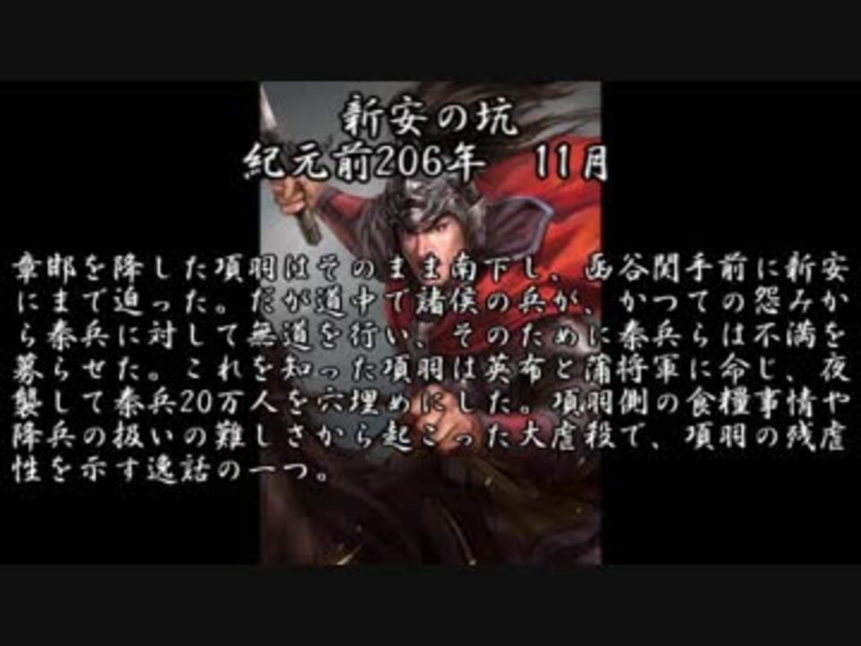 <span style="color: #000000; font-size: 14px;">楚漢戦争を解説していきます。<br>いにしえ武将紹介から大きく外れますが、三國志シリーズの立ち絵を使うので、 タイトルとタグには三國志を含みます。<br>劇中の物事の経緯や登場人物の性格など、かなり自分なりの私見を含みますのでご注意ください。</span><br><br>両方とも誇張され気味で、実際どれほどの効果、実数だったのかきになるところ<br><span style="color: #000000; font-size: 14px;"> <br>楚漢戦争</span><span style="color: #006699; font-size: 14px;"><a href="https://www.nicovideo.jp/mylist/63092896" target="_blank" rel="noopener">mylist/63092896</a></span><br><br><span style="color: #000000; font-size: 14px;">いにしえ武将紹介</span><span style="color: #006699; font-size: 14px;"><a href="https://www.nicovideo.jp/mylist/61740403" target="_blank" rel="noopener">mylist/61740403</a></span><br><br><a href="https://www.nicovideo.jp/watch/sm34583362" class="watch">sm34583362</a><span style="color: #000000; font-size: 14px;">←前 次→</span><a href="https://www.nicovideo.jp/watch/sm34666421" class="watch">sm34666421</a>