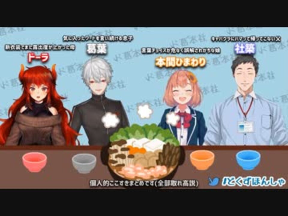 正直全部取れ高だけど頑張って絞ってまとめましたァ!<br>始末書ものだった最後の感想シーンを見易く編集したので<br>振り返りに是非ご活用下さい。 Just like TT<br><br>2019-02-10<br>【ド葛本社】家族の絆を取り戻せ~鍋バトル!【オフラインコラボ】<br>本編(3時間13分)→<a href="https://youtu.be/0cfruH8ufOI" target="_blank" rel="noopener nofollow">https://youtu.be/0cfruH8ufOI</a><br><br><span style="color: #cc0000;"><strong>父のキャバクラ通いがバレ家族会議になる【第五回】(<a href="https://www.nicovideo.jp/watch/sm34612464" class="watch">sm34612464</a>)</strong></span><br><strong>その後→鍋パの話と家族のモノマネをするドラひま(<a href="https://www.nicovideo.jp/watch/sm34621440" class="watch">sm34621440</a>)</strong><br>ド葛本社マイリスト(<a href="https://www.nicovideo.jp/mylist/64046222" target="_blank" rel="noopener">mylist/64046222</a>)<br><br><span style="color: #ff0000; font-size: 13px;">ドーラ@にじさんじ</span><br>YouTube→ <a href="http://urx2.nu/Qf47" target="_blank" rel="noopener nofollow">http://urx2.nu/Qf47</a><br>Twitter→ <a href="https://twitter.com/___dola" target="_blank" rel="noopener nofollow">https://twitter.com/___dola</a> <br><span style="color: #990000; font-size: 13px;">葛葉@にじさんじ</span><br>YouTube→ <a href="https://goo.gl/UV3xFN" target="_blank" rel="noopener nofollow">https://goo.gl/UV3xFN</a> <br>Twitter→ <a href="https://twitter.com/Vamp_Kuzu" target="_blank" rel="noopener nofollow">https://twitter.com/Vamp_Kuzu</a><br><span style="color: #e69138; font-size: 13px;">本間ひまわり@にじさんじ </span><br>YouTube→ <a href="https://goo.gl/zXoSEh" target="_blank" rel="noopener nofollow">https://goo.gl/zXoSEh</a> <br>Twitter→ <a href="https://twitter.com/honmahimawari" target="_blank" rel="noopener nofollow">https://twitter.com/honmahimawari</a><br><span style="color: #3c78d8;">社築@にじさんじ</span><br>YouTube→ <a href="http://urx2.nu/Qf45" target="_blank" rel="noopener nofollow">http://urx2.nu/Qf45</a><br>Twitter→ <a href="https://twitter.com/846kizuQ" target="_blank" rel="noopener nofollow">https://twitter.com/846kizuQ</a> <br><br /><span style="color: #6fa8dc; font-size: 10px;">・・・各リンク・・・<br>Twitter▶<a href="https://twitter.com/NemunokiVVV" target="_blank" rel="noopener nofollow">https://twitter.com/NemunokiVVV</a> <br>YouTube▶</span><span style="color: #6d9eeb; font-size: 10px;"><a href="https://www.youtube.com/channel/UCcEXdLbhQtqzxT6wc0ye2ag" target="_blank" rel="noopener nofollow">https://www.youtube.com/channel/UCcEXdLbhQtqzxT6wc0ye2ag</a></span><br><span style="color: #6fa8dc; font-size: 10px;">マイリスト一覧▶<a href="http://ur0.link/wHWQ" target="_blank" rel="noopener nofollow">http://ur0.link/wHWQ</a></span><br><span style="color: #93c47d; font-size: 10px;">・・・フリー素材 使用動画あり・・・<br>No Copyright Motion Graphics<br>Motion Graphics provided by <a href="http://www.youtubestock.com" target="_blank" rel="noopener nofollow">http://www.youtubestock.com</a><br>YouTube Channel: <a href="https://goo.gl/aayJRf" target="_blank" rel="noopener nofollow">https://goo.gl/aayJRf</a><br>Otologic <a href="https://otologic.jp/" target="_blank" rel="noopener nofollow">https://otologic.jp/</a></span><br><span style="color: #e06666; font-size: 10px;">・・・注意事項・・・<br>◆無闇に動画・配信等で私の名前を出さないでください<br>◆過度な誹謗中傷・煽りコメはNG対象になります<br>◆無断転載はお控えください(コメ付きでも×)</span>