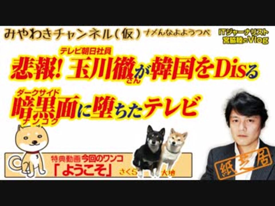 テレビ朝日社員玉川徹さんが韓国を「調子に乗りすぎ」とDisる。<br>暗黒(ナンコク)面に堕ちた「モーニングショー」の出演者たち。<br><br>0:30 韓国は調子コイている」と玉川さん<br>3:00 やっぱり平壌営業だった玉川さん<br>6:14 ダークサイドに堕ちたモーニングショー<br>9:49 金持ち喧嘩せずと韓国をDisる玉ちゃん<br>11:29 ダークサイドからの「相対化」攻撃<br>13:09 今回のワンコ「ようこそ」<br><br>みやわきチャンネル(仮)#373Restart231<br>(旧・マスコミでは言えないこと)<br>オリジナル2019年2月27日配信<br><br>番組の最後に「柴犬」のコーナーがあります。<br>今回のワンコ「ようこそ」<br><br>■わんこ総集編はこちらから!<br>何かあっても大丈夫、のはず。仮にこの「ワンコチャンネル」になにかあれば・・・オッス、○○と。<br>今回のワンコ総集編〜さくら&大地〜<br><a href="https://www.youtube.com/channel/UChwY..." target="_blank" rel="noopener nofollow">https://www.youtube.com/channel/UChwY...</a><br><br>■ニコニコ動画<br><a href="http://www.nicovideo.jp/user/13610165" target="_blank" rel="noopener nofollow">http://www.nicovideo.jp/user/13610165</a><br>■FRESH LIVE<br><a href="https://freshlive.tv/miyawaki-ch" target="_blank" rel="noopener nofollow">https://freshlive.tv/miyawaki-ch</a><br>■FC2動画<br><a href="https://video.fc2.com/account/16696711" target="_blank" rel="noopener nofollow">https://video.fc2.com/account/16696711</a><br>■YouTube(理不尽に消えることあり)<br><a href="https://www.youtube.com/c/AtsushiMiyawaki" target="_blank" rel="noopener nofollow">https://www.youtube.com/c/AtsushiMiyawaki</a><br><br>■いつ「消える」かわかりません。<br>そこでオフィシャルサイトで「非常用連絡先」をご確認ください。<br>「みやチャン(仮)」公式サイト「MiyawakiNewsNetwork」<br><a href="http://www.miyawakiatsushi.net" target="_blank" rel="noopener nofollow">http://www.miyawakiatsushi.net</a><br><br>■理不尽に消えたとき、以下で情報配信しております。ぜひ、ご登録ください。<br><br>■ツイッター<br><a href="https://twitter.com/miyawakiatsushi" target="_blank" rel="noopener nofollow">https://twitter.com/miyawakiatsushi</a><br>■Facebook<br><a href="https://www.facebook.com/miyawakiatsushi" target="_blank" rel="noopener nofollow">https://www.facebook.com/miyawakiatsushi</a>