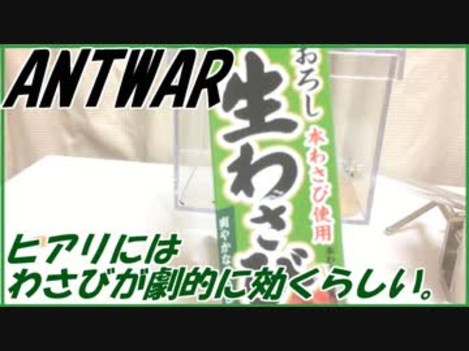 <a href="https://www.nicovideo.jp/watch/sm34696096" class="watch">sm34696096</a>←もどる 次へ→<a href="https://www.nicovideo.jp/watch/sm34731555" class="watch">sm34731555</a><br>火曜・土曜の週2回更新。<br><br>蟻戦争マイリスト→<u><a href="https://www.nicovideo.jp/mylist/56298874" target="_blank" rel="noopener">mylist/56298874</a></u><br><br>∧__∧<br>(・ω・)<ワサビを使ったヒアリ対策、早く実用化されてほしい。<br><br>蟻は高度な社会性を持つ昆虫である。<br>~The ANT is advanced social insect.~<br><br>卵を産む役、飼育する役、兵隊役などに分かれ、1つのコミュニティを形成する。<br>~ANTs constitute one comunity.ANTs have the part(childbirth,bring<br>up,military service) in the community.~<br><br>本来出会わないはずの2つの種族が遭遇した時、我々は彼らの未知なる知性を発見するかもしれない。~ We may discover their intelligences when two species encounter.~