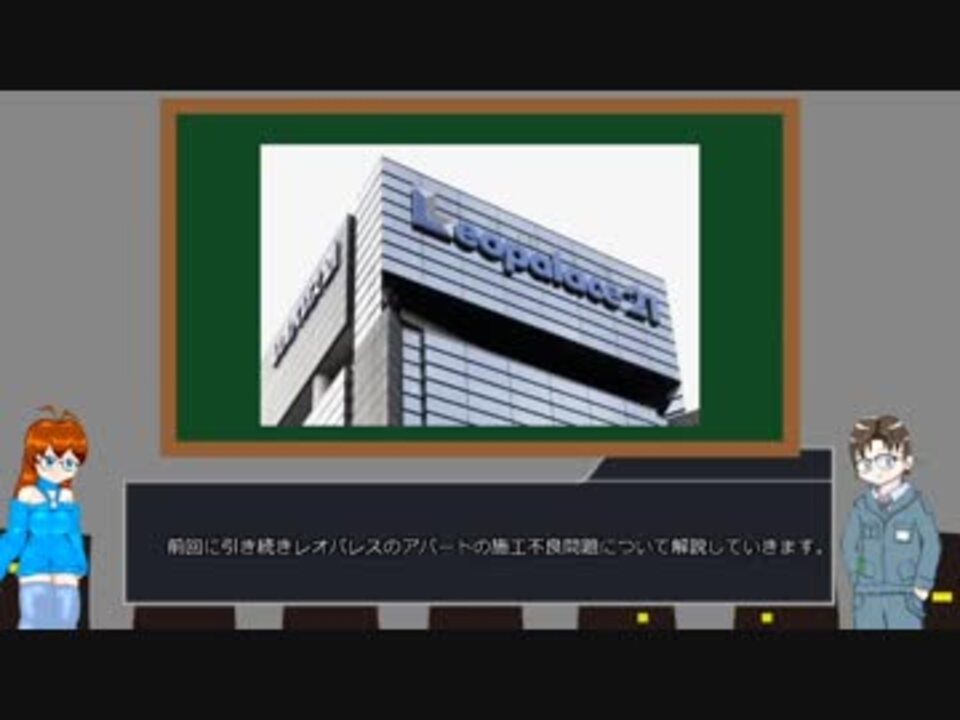 <br>現在ニュースで騒がれているレオパレスのアパートの施工不良問題について解説します。<br><br><br>この問題に関心のある方もそうでない方も建築における重大な問題に関して関心を持っていただければと思います。<br><br><span style="color: #14171a; font-size: 27px;"> </span><br><span style="color: #000000; font-size: 13px;">前編 <a href="https://www.nicovideo.jp/watch/sm34682726" class="watch">sm34682726</a> </span><br>後編 <a href="https://www.nicovideo.jp/watch/sm34753627" class="watch">sm34753627</a><br>は技術的な解説をしましたが、今回は「人」の問題として、施工の管理、監理体制の問題、そして不良を見抜けずに検査で合格させ、世に送り出した行政の問題について解説していきます。<br><br>目次<br>0:00~冒頭<br>1:23~前回からの事件の続報<br>4:00~建物の設計と設計図面の行政審査について<br>13:32~行政の現場の「検査」について<br>18:50~編集後記<br><br><br><br>の予定で進めてまいります。 後編投稿予定→<a href="https://www.nicovideo.jp/watch/sm34753627" class="watch">sm34753627</a><br><br>前回の動画をご視聴、コメントいただいた方誠にありがとうございました!!<br>コメントはこの解説が終了次第、まとめて返信する回を設ける予定です。<br>聞いてみたいことがあればどしどしお願いします!!<br><br>過去のコメント返し→<a href="https://www.nicovideo.jp/watch/sm34216869" class="watch">sm34216869</a><br><br>過去の建築解説講座↓<br>ゆっくり建築解説講座マイリストまとめ →<a href="https://www.nicovideo.jp/mylist/62521053" target="_blank" rel="noopener">mylist/62521053</a><br>ゆっくり建築士試験対策まとめ→<a href="https://www.nicovideo.jp/mylist/63324003" target="_blank" rel="noopener">mylist/63324003</a><br>映画の中の建築家解説→<a href="https://www.nicovideo.jp/mylist/64087179" target="_blank" rel="noopener">mylist/64087179</a><br>こちらも興味があれば御覧ください。<br><br>コメント、ご意見おまちしております。<br><br>twitter: <a href="https://twitter.com/miz_otty" target="_blank" rel="noopener nofollow">https://twitter.com/miz_otty</a><br><br>ツイッターの質問箱 <a href="https://peing.net/ja/miz_otty?event=0" target="_blank" rel="noopener nofollow">https://peing.net/ja/miz_otty?event=0</a><br>こちらからの質問もお待ちしてます。<br><br>ご質問はメールでもどうぞ eukiwaterfall@gmail.com<br><br>noteの記事サービスもやってます。 動画講座のことやそれ以外の建築に関することを書いてます。 こちらもよろしくおねがいします。<br><br><a href="https://note.mu/mix_otty" target="_blank" rel="noopener nofollow">https://note.mu/mix_otty</a><br><br><br><br><br><br><br>