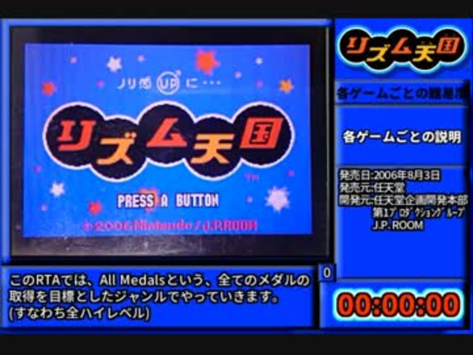 えばやん氏の動画でリズム天国をプレイしたくなったので初投稿です。<br>低画質でごめんなさい。<br><br>追記:speedrun.comで記録が承認され、<s>正式にWRになりました</s>。<br>ボーニン氏に1分13秒更新されました。おめでとうございます。<br>黄昏カエル氏の調査によると、リミックス6の評価の「かなりサイコーです!」が出た瞬間にリセットを押すのが最適のようです。又、しろいおばけでおばけを適当に逃がすことでも短縮化できます。<br>2019年3月号RTAランキングの16位にランキングしていました。ありがとうございます。<br><br>YouTube:<a href="https://youtu.be/NYn8OuGKyds" target="_blank" rel="noopener nofollow">https://youtu.be/NYn8OuGKyds</a><br>無編集:<a href="https://youtu.be/60pvWmHZq6A" target="_blank" rel="noopener nofollow">https://youtu.be/60pvWmHZq6A</a><br>他の作品:<a href="https://www.nicovideo.jp/mylist/58258609" target="_blank" rel="noopener">mylist/58258609</a> <a href="https://www.nicovideo.jp/mylist/58395642" target="_blank" rel="noopener">mylist/58395642</a> <a href="https://www.nicovideo.jp/mylist/60882848" target="_blank" rel="noopener">mylist/60882848</a><br><span style="color: #000000; font-size: 13px;">MQube:<a href="https://mqube.net/user/ngtwinppx" target="_blank" rel="noopener nofollow">https://mqube.net/user/ngtwinppx</a> (チップチューンアレンジ上げてます。よかったらどうぞ。)</span><br><br><strong>にのなん兄貴、111の退役軍人兄貴、すめらぎみかど兄貴、炉利子兄貴、謎のリズム組織兄貴、ルーク兄貴、Bornin兄貴、dokan兄貴、まいむまいむ兄貴、幽祢兄貴、無人ヘリ兄貴、kappa兄貴、ピロシキ兄貴、ARIKA兄貴、CV兄貴、手のひらサイズ兄貴、迷える汝兄貴、AZUKI兄貴、泥魚兄貴、犬兄貴、GN炭酸兄貴、はらべる兄貴、揚げたぬき兄貴、OgaMatin兄貴、ひさびー兄貴、ツクールフェス兄貴、のりしげ兄貴、けんいち兄貴、園ジゅつ兄貴、アサリ兄貴、 (∩゚д゚)<Nao兄貴、mario881023兄貴、werver兄貴、風船兄貴、サブロック兄貴、イカ爆弾兄貴、ジュキロ兄貴、ねくたる兄貴、Nee兄貴、kappa兄貴、イータ兄貴、aiko_shiki兄貴、暇人兄貴、浅野兄貴、アリサ・C・フェミルナ兄貴、マドハンド兄貴、雨弓兄貴、パンダ兄貴、ありあ兄貴、はにわ兄貴、ンー酸兄貴、白助兄貴、がっきー兄貴、あああ兄貴、ライテル兄貴、citrus兄貴、新田 和美兄貴、くろ飴兄貴、だいら兄貴、紙袋兄貴、チームわにわに兄貴、広告ありがとナス!</strong>
