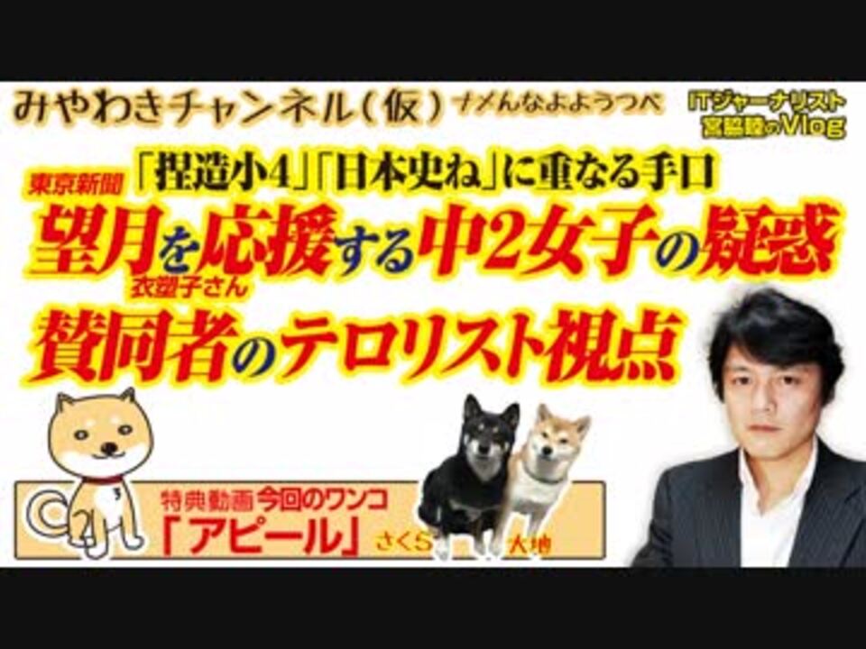 東京新聞・望月衣塑子さんを応援する中2女子に浮かぶ疑惑。<br>「捏造小4」「日本史ね」に重なる手口。<br><br>0:10 中学2年生(仮)が「いじめ」ダメ<br>3:14 ルールも立場もまるっと無視する発想<br>6:07 子供にはしがらみがないというのは大嘘<br>8:02 足立区ベビーカーママ反乱の真相はこうだ<br>10:26 望月一派のテロ的ロジックと工作疑惑?<br>14:19 今回のワンコ「アピール」<br><br>みやわきチャンネル(仮)#380Restart238<br>(旧・マスコミでは言えないこと)<br>オリジナル2019年3月4日配信<br><br>番組の最後に「柴犬」のコーナーがあります。<br>今回のワンコ「アピール」<br><br>■わんこ総集編はこちらから!<br>何かあっても大丈夫、のはず。仮にこの「ワンコチャンネル」になにかあれば・・・オッス、○○と。<br>今回のワンコ総集編〜さくら&大地〜<br><a href="https://www.youtube.com/channel/UChwY..." target="_blank" rel="noopener nofollow">https://www.youtube.com/channel/UChwY...</a><br><br>■ニコニコ動画<br><a href="http://www.nicovideo.jp/user/13610165" target="_blank" rel="noopener nofollow">http://www.nicovideo.jp/user/13610165</a><br>■FRESH LIVE<br><a href="https://freshlive.tv/miyawaki-ch" target="_blank" rel="noopener nofollow">https://freshlive.tv/miyawaki-ch</a><br>■FC2動画<br><a href="https://video.fc2.com/account/16696711" target="_blank" rel="noopener nofollow">https://video.fc2.com/account/16696711</a><br>■YouTube(理不尽に消えることあり)<br><a href="https://www.youtube.com/c/AtsushiMiyawaki" target="_blank" rel="noopener nofollow">https://www.youtube.com/c/AtsushiMiyawaki</a><br><br>■いつ「消える」かわかりません。<br>そこでオフィシャルサイトで「非常用連絡先」をご確認ください。<br>「みやチャン(仮)」公式サイト「MiyawakiNewsNetwork」<br><a href="http://www.miyawakiatsushi.net" target="_blank" rel="noopener nofollow">http://www.miyawakiatsushi.net</a><br><br>■理不尽に消えたとき、以下で情報配信しております。ぜひ、ご登録ください。<br><br>■ツイッター<br><a href="https://twitter.com/miyawakiatsushi" target="_blank" rel="noopener nofollow">https://twitter.com/miyawakiatsushi</a><br>■Facebook<br><a href="https://www.facebook.com/miyawakiatsushi" target="_blank" rel="noopener nofollow">https://www.facebook.com/miyawakiatsushi</a>