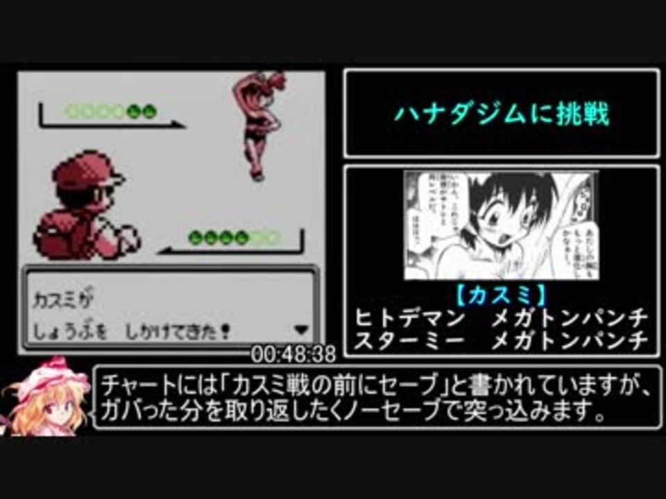 豪運をガバで帳消しにしていくスタイル<br>クチバジムの仕掛けについて参考にしたサイトはこちら<a href="http://hakuda2.web.fc2.com/wario/poke2/r16-2.html" target="_blank" rel="noopener nofollow">http://hakuda2.web.fc2.com/wario/poke2/r16-2.html</a><br>今回はハナダジム挑戦 ~ タマムシシティ到着まで<br><br>前回<a href="https://www.nicovideo.jp/watch/sm34598553" class="watch">sm34598553</a> 次回<a href="https://www.nicovideo.jp/watch/sm34915577" class="watch">sm34915577</a><br>今作一覧<a href="https://www.nicovideo.jp/mylist/64533916" target="_blank" rel="noopener">mylist/64533916</a> 自作一覧<a href="https://www.nicovideo.jp/mylist/64541906" target="_blank" rel="noopener">mylist/64541906</a> 自作一覧(旧)<a href="https://www.nicovideo.jp/mylist/59452496" target="_blank" rel="noopener">mylist/59452496</a><br>YouTube版 <a href="https://www.youtube.com/watch?v=RANcJv3Od30" target="_blank" rel="noopener nofollow">https://www.youtube.com/watch?v=RANcJv3Od30</a><br><br>Q.バッジの効果って対戦にも乗る?<br>A.乗りません(ポケモンwiki参照)<br>Q.この後のシリーズはバッジでステータス上がる?<br>A.上がりません(同上)<br>Q.先に引換券貰っておけば2度目の居合斬りいらなかったのでは?<br>A.クチバジム内では穴を掘れません<br><br>宣伝してくれた皆様、ありがとうございました