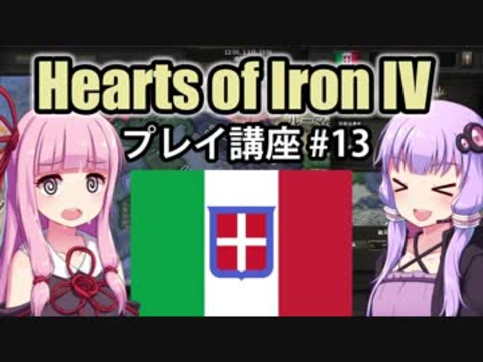 Hearts of Iron IV (HoI4) の遊び方を初心者向けに解説していくプレイ動画。<br>第13回はイタリアの独ソ戦参戦。空挺師団とDLC要素 (指揮力・レンドリース等) の解説。<br><br>プレイ環境 : <span style="color: #cc4125;"><strong><u>HoI4 Ver1.5.4</u></strong></span><br>HoI4日本語化MOD(ver 1.5.4対応) <a href="https://steamcommunity.com/sharedfiles/filedetails/?id=699539183" target="_blank" rel="noopener nofollow">https://steamcommunity.com/sharedfiles/filedetails/?id=699539183</a><br><br>前 : 第12話 (<a href="https://www.nicovideo.jp/watch/sm34661623" class="watch">sm34661623</a>) <-> 次 : 第14話(<a href="https://www.nicovideo.jp/watch/sm34856759" class="watch">sm34856759</a>)<br>このシリーズのマイリス : <a href="https://www.nicovideo.jp/mylist/62136132" target="_blank" rel="noopener">mylist/62136132</a><br><br># 今回はDLC (Together for Victory~Waking the Tiger)の内容も入るよ?<br># <s>MtGの海軍ややこしすぎないですかね…?</s>