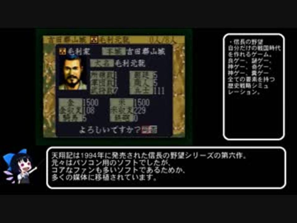 信長の野望天翔記の早解きの紹介動画となっています。<br><span style="color: #262626; font-size: small;">Real Time AttackではなくReal Turn数 Attackの動画です。</span><br><br>ハードはプレステ通常版、難易度上級。<br>1534年信長誕生シナリオ。<br>選択した大名は毛利家。<br>セーブロード自由。<br>複数大名を選択してのプレイ禁止。<br><br>他の細かいルールは先駆者もライバルもいないので特に決めていません。<br><br>〇シリーズ<br>第一回:ココ<br><span style="color: #000000;">第二回:</span><a href="https://www.nicovideo.jp/watch/sm34765699" class="watch">sm34765699</a><br>第三回:<a href="https://www.nicovideo.jp/watch/sm34765749" class="watch">sm34765749</a><br><br><br>ゲームシステムが知りたい人向けの通常プレイ動画(琴葉姉妹実況)<br><span style="font-size: 24px;"><a href="https://www.nicovideo.jp/watch/sm34632965" class="watch">sm34632965</a></span><br><br><span style="color: #000000; font-size: 14px;">マイリスト:</span><span style="color: #006699; font-size: 13px;"><a href="https://www.nicovideo.jp/mylist/58018546" target="_blank" rel="noopener">mylist/58018546</a></span><br>(普段はポケモン動画ばかり投稿しています)<br><br /><br><span style="color: #262626; font-size: 18px;">【twitter】</span><br><span style="font-size: 18px;"><a href="https://twitter.com/kuitan9" target="_blank" rel="noopener nofollow">https://twitter.com/kuitan9</a> </span><br><br><span style="color: #262626; font-size: 18px;">【YouTubeチャンネル】</span><br><span style="font-size: 18px;"><a href="https://www.youtube.com/channel/UCWj1tR-j3xAhAFmVVw6WD0w" target="_blank" rel="noopener nofollow">https://www.youtube.com/channel/UCWj1tR-j3xAhAFmVVw6WD0w</a></span><br><br><span style="color: #ff0000; font-size: 24px;"><strong>ニコニコのフォローと一緒にYoutubeのチャンネル登録もお待ちしています。</strong></span>