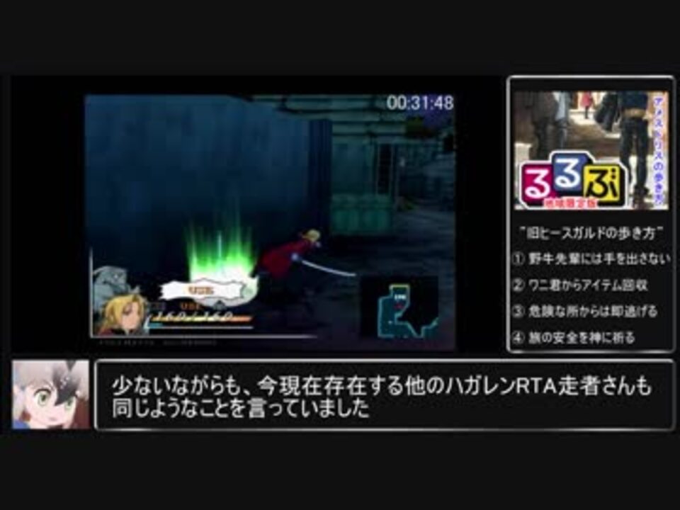 [RTA] 鋼の錬金術師_翔べない天使_ノーセーブ全ボス撃破RTA_4時間9分14秒part1<br><br>初投稿です。<br><br>PS2ソフト「鋼の錬金術師 翔べない天使」の1週目全ボス撃破RTA動画です。<br>計測区間<br>タイマー計測スタート:NewGame開始<br>タイマー計測終了:ラスボス戦戦闘結果表示時<br><br>プレイ環境:実機薄型PS2使用(SCPH-75000)&純正コントローラー使用<br>タイマー:AviUtlスクリプトによる後付け<br><br>また、好タイムクリアを目指し、そのための縛りとして完走までノーセーブでプレイしています。<br>ハガレンシリーズは、RTA走者が少なく発展途上なので興味のある方はぜひ参加してください。<br><br>マイリスト:<span style="color: #006699; font-size: 14px;"><a href="https://www.nicovideo.jp/mylist/65006142" target="_blank" rel="noopener nofollow">https://www.nicovideo.jp/mylist/65006142</a></span><br>前:<a href="https://www.nicovideo.jp/watch/sm34778231" class="watch">sm34778231</a> 次::<a href="https://www.nicovideo.jp/watch/sm34778426" class="watch">sm34778426</a>