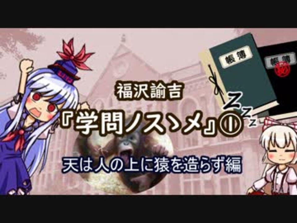 福沢諭吉の著作の中でもっとも有名な『学問ノスゝメ』を、これから紹介します。<br>自宅を離れなければいけない日が三日もあって作業が遅れて、すみません。<br><br>なんか投稿動画が非公開になってたようですが、なにもかも手探りで始めているのでおかしいところがあったらご教授いただければ幸いです。<br><br>次 → <a href="https://www.nicovideo.jp/watch/sm34843431" class="watch">sm34843431</a><br><br>Youtube: <a href="https://www.youtube.com/channel/UC4wWy_dvnLrUvW3fvIyufEA" target="_blank" rel="noopener nofollow">https://www.youtube.com/channel/UC4wWy_dvnLrUvW3fvIyufEA</a><br><br>素材の提供元:<br>かわいいフリー素材集 いらすとや<br><a href="https://www.irasutoya.com/" target="_blank" rel="noopener nofollow">https://www.irasutoya.com/</a><br>効果音ラボ<br><a href="https://soundeffect-lab.info/" target="_blank" rel="noopener nofollow">https://soundeffect-lab.info/</a><br>東方アレンジ倉庫「ajapaのBGM」<br><a href="http://ajapabgm.html.xdomain.jp/" target="_blank" rel="noopener nofollow">http://ajapabgm.html.xdomain.jp/</a><br>ニコニ・コモンズ<br><a href="http://commons.nicovideo.jp/" target="_blank" rel="noopener nofollow">http://commons.nicovideo.jp/</a>