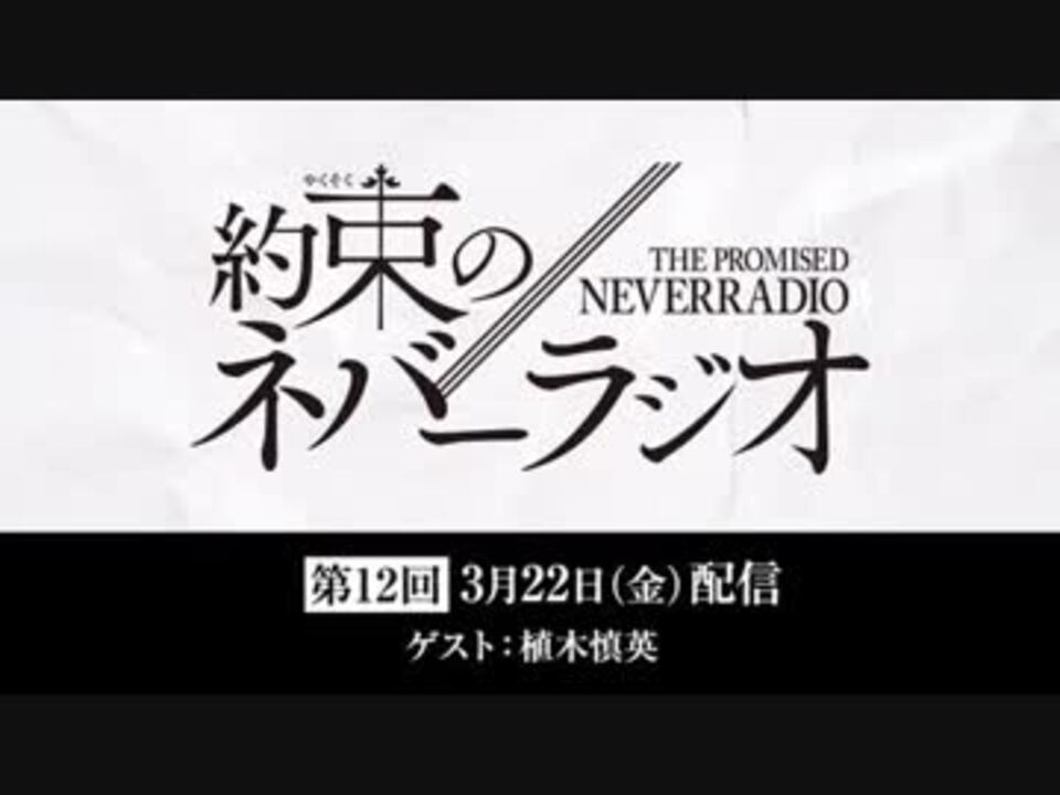 ゲスト 植木慎英<br>エマ役・諸星すみれさんとフィル役・河野ひよりさんが「約束のネバーランド」の情報をお届けするWEBラジオ!<br>たくさんのメールをお待ちしています。<br>TVアニメ「約束のネバーランド」は1月10日(木)25時10分よりフジテレビ“ノイタミナ”ほかにて放送開始!(初回15分押し)<br>Amazon Prime Videoにて1月9日24時頃より第1話先行配信!<br><br>■コーナー紹介<br>・GFメール<br>作品の舞台「グレイス=フィールドハウス」にちなんで、<br>「グレイス=普通のメール」ふつおたをご紹介します。<br>作品にまつわる“おたより”を皆さんから大募集!<br>パーソナリティへのメッセージも大歓迎!<br>・抗え。リスナーの運命に!<br>リスナーの皆さんから「今抗っていること」、「立ち向かっていること」、<br>「挑んでること」、「覆したいこと」を大募集!<br>リスナーさんを“運命”と言う箱庭から脱出させるべく、<br>諸星さん・河野さんが真剣に打開策を考えます。<br>・10Secondsテストルーム<br>諸星さん・河野さんが様々な「10秒で結果の出る様々なテスト」に挑戦!<br>2人にやってほしい、簡単にできて結果がでるテストを募集します。<br>おたより募集中!<br><a href="https://neverland-anime.com/radio/" target="_blank" rel="noopener nofollow">https://neverland-anime.com/radio/</a><br><br>TVアニメ「約束のネバーランド」<br>公式サイト:<a href="https://neverland-anime.com/" target="_blank" rel="noopener nofollow">https://neverland-anime.com/</a><br>公式Twitter:<a href="https://twitter.com/yakuneba_staff" target="_blank" rel="noopener nofollow">https://twitter.com/yakuneba_staff</a><br>公式Instagram:<a href="https://www.instagram.com/neverland_a..." target="_blank" rel="noopener nofollow">https://www.instagram.com/neverland_a...</a><br>公式LINE@:<a href="https://line.me/R/ti/p/%40mvs7156d" target="_blank" rel="noopener nofollow">https://line.me/R/ti/p/%40mvs7156d</a><br><a href="https://www.nicovideo.jp/mylist/64257282" target="_blank" rel="noopener">mylist/64257282</a>