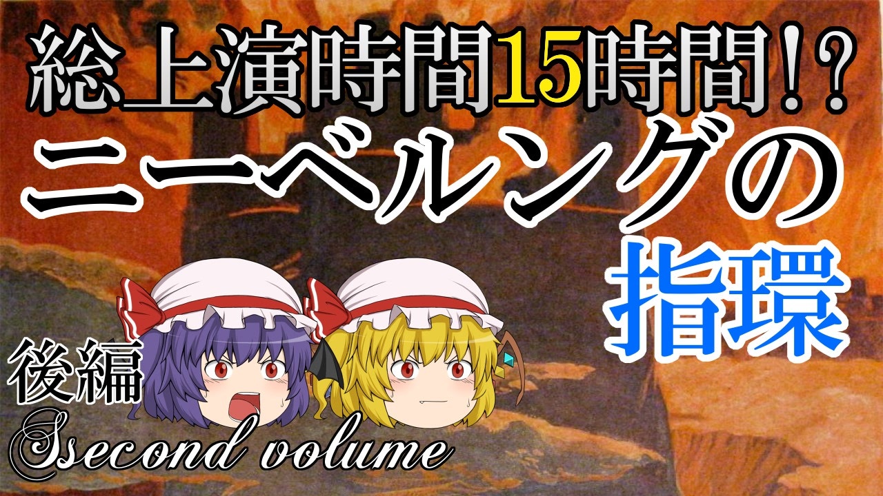 【ファンタジーアイテムをゆっくり解説】 ニーベルングの指輪(後編)<br><br>ファンタジー世界のアイテム達が幻想郷入り!<br>アイテム編第五回は「ニーベルングの指輪」後編の解説です。<br><br>《重要》<br>動画時間17:30付近より語られるハーゲンとグンターの関係が事実とは逆になっています。<br>正しくは"ハーゲン"が"グンター"を○しています。<br>最後に指輪を追って水に飛び込むのも、グンターではなくハーゲンです。<br>また動画内で子細を解説するに至っていませんが、ハーゲンはアルベリヒの息子にあたるため、劇終盤での暴挙には一貫した背景があります。<br>本動画はあくまでアイテムとしての指輪の解説、及びそれに絡めたオペラのあらすじといった趣旨であり、オペラの内容を正確に知ることを目的としたものではありません。<br>オペラ「ニーベルングの指輪」の内容については、より詳細に解説したサイトや書籍、DVDボックス等をご参照くださいますようお願いいたします。<br><br>前編 <a href="https://www.nicovideo.jp/watch/sm34697537" class="watch">sm34697537</a><br>前回「オリハルコン」 <a href="https://www.nicovideo.jp/watch/sm34320690" class="watch">sm34320690</a><br>次回「変若水」 <a href="https://www.nicovideo.jp/watch/sm35639968" class="watch">sm35639968</a><br><br>第一回から <a href="https://www.nicovideo.jp/watch/sm33235401" class="watch">sm33235401</a><br />※現在活動再開に向けて準備中です。<br> ご支援を頂ければ制作の励みになります。<br> <a href="https://doneru.jp/reg-yukkuri" target="_blank" rel="noopener nofollow">https://doneru.jp/reg-yukkuri</a><br><br>他の動画はコチラからどうぞ!<br><a href="https://www.nicovideo.jp/series/325541" target="_blank" rel="noopener nofollow">https://www.nicovideo.jp/series/325541</a><br><br>うp主ブログ<br><a href="https://regular-ch.hatenablog.com/" target="_blank" rel="noopener nofollow">https://regular-ch.hatenablog.com/</a><br>※更新停止中<br><br><span style="font-size: 14px;">うp主ツイッター</span><br><span style="color: #006699; font-size: 14px;"><a href="https://twitter.com/8257R?lang=ja" target="_blank" rel="noopener nofollow">https://twitter.com/8257R?lang=ja</a></span>