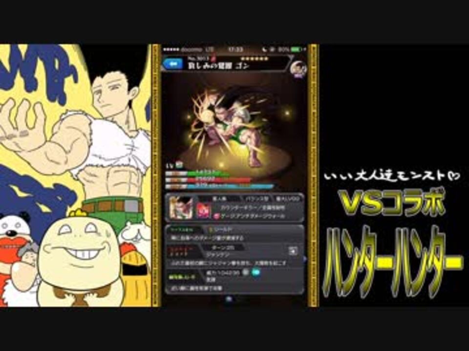 いい大人達が「モンスターストライク」のコラボイベント<br>「ハンターハンター」を本気で遊んでみました。<br>本人達は至って本気でプレイしておりますが、腕前の方はお察し下さい。<br><br>登場人物:いつも愉快なタイチョー、頼れる技術担当ノッチ、紅一点マオー、歳はみんなと同じだけどオッサン<br><br>(ご注意!)メンバーが絶叫している箇所が多々あります。音量にご注意ください。<br><br>次→<a href="https://www.nicovideo.jp/watch/sm34852681" class="watch">sm34852681</a><br><br />これまでの実況【1】→<a href="https://www.nicovideo.jp/mylist/17828031" target="_blank" rel="noopener">mylist/17828031</a> 【2】→<a href="https://www.nicovideo.jp/mylist/38856455" target="_blank" rel="noopener">mylist/38856455</a><br>ラジオ→<a href="https://www.nicovideo.jp/mylist/28752088" target="_blank" rel="noopener">mylist/28752088</a><br><br>▼いい大人達のチャンネルもどうぞよろしく!<br><br>【ユーザーチャンネル】<br><a href="https://ch.nicovideo.jp/iiotonatati" target="_blank" rel="noopener nofollow">https://ch.nicovideo.jp/iiotonatati</a><br><a href="https://www.youtube.com/channel/UC6yZqCvi948QFxMjjKbPEvw" target="_blank" rel="noopener nofollow">https://www.youtube.com/channel/UC6yZqCvi948QFxMjjKbPEvw</a><br><br>【エクストラチャンネル】<br><a href="https://ch.nicovideo.jp/iiotonatatiex" target="_blank" rel="noopener nofollow">https://ch.nicovideo.jp/iiotonatatiex</a><br><a href="https://www.youtube.com/@iiotonatati" target="_blank" rel="noopener nofollow">https://www.youtube.com/@iiotonatati</a><br><br>【いい大人達ポータルサイト】<br><a href="https://iiotonatati.co.jp/blog/" target="_blank" rel="noopener nofollow">https://iiotonatati.co.jp/blog/</a><br>メンバー個人chも登場!