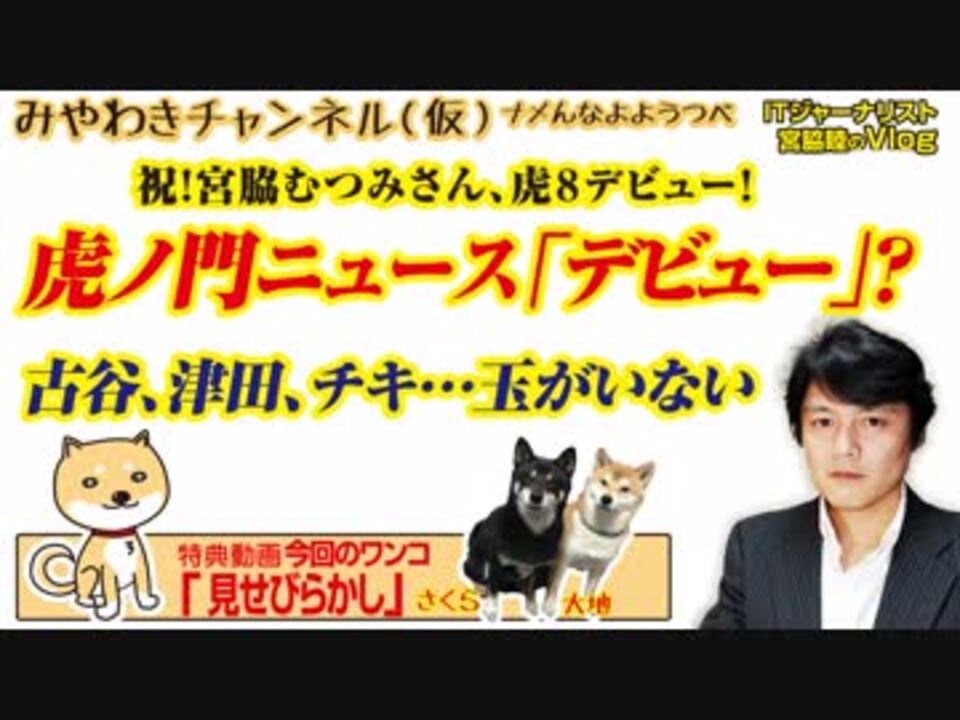 祝!、虎8デビュー!<br>虎ノ門ニュースに宮脇むつみさん「デビュー」。<br>古谷さん流浪の旅と、津田さんがブレイクした理由は「実況板」。<br>論客のなかに玉さんの名前がない。<br><br>0:08 虎8デビュー!?「むつみ」って誰だ<br>3:09 モップ、ゲスチキの変遷を上念氏語る<br>6:25 津田さんが「有名」になった理由とブロック<br>9:22 シーマンを超絶擁護する上念さんの思惑<br>11:37 お願い!若手論客に大人気玉ちゃんを<br>14:28 今回のワンコ「見せびらかし」<br><br>みやわきチャンネル(仮)|#400Restart258<br>(旧・マスコミでは言えないこと)<br>オリジナル2019年3月25日配信<br><br>番組の最後に「柴犬」のコーナーがあります。<br>今回のワンコ「見せびらかし」<br><br><br>■わんこ総集編はこちらから!<br>何かあっても大丈夫、のはず。仮にこの「ワンコチャンネル」になにかあれば・・・オッス、○○と。<br>今回のワンコ総集編〜さくら&大地〜<br><a href="https://www.youtube.com/channel/UChwY..." target="_blank" rel="noopener nofollow">https://www.youtube.com/channel/UChwY...</a><br><br>■ニコニコ動画<br><a href="http://www.nicovideo.jp/user/13610165" target="_blank" rel="noopener nofollow">http://www.nicovideo.jp/user/13610165</a><br>■FRESH LIVE<br><a href="https://freshlive.tv/miyawaki-ch" target="_blank" rel="noopener nofollow">https://freshlive.tv/miyawaki-ch</a><br>■FC2動画<br><a href="https://video.fc2.com/account/16696711" target="_blank" rel="noopener nofollow">https://video.fc2.com/account/16696711</a><br>■YouTube(理不尽に消えることあり)<br><a href="https://www.youtube.com/c/AtsushiMiyawaki" target="_blank" rel="noopener nofollow">https://www.youtube.com/c/AtsushiMiyawaki</a><br><br>■いつ「消える」かわかりません。<br>そこでオフィシャルサイトで「非常用連絡先」をご確認ください。<br>「みやチャン(仮)」公式サイト「MiyawakiNewsNetwork」<br><a href="http://www.miyawakiatsushi.net" target="_blank" rel="noopener nofollow">http://www.miyawakiatsushi.net</a><br><br>■理不尽に消えたとき、以下で情報配信しております。ぜひ、ご登録ください。<br><br>■ツイッター<br><a href="https://twitter.com/miyawakiatsushi" target="_blank" rel="noopener nofollow">https://twitter.com/miyawakiatsushi</a><br>■Facebook<br><a href="https://www.facebook.com/miyawakiatsushi" target="_blank" rel="noopener nofollow">https://www.facebook.com/miyawakiatsushi</a>