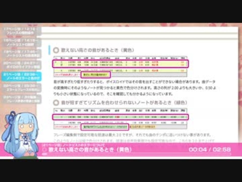 2018年9月のイベントで頒布したKotonoSyncの解説本を葵ちゃんに読み上げてもらいました。<br>KotonoSyncでボイスロイドに歌ってもらいたいときに良かったら参考にしてみてください。<br>全4パートの予定です。<br><br>前(part1):<a href="https://www.nicovideo.jp/watch/sm34837102" class="watch">sm34837102</a> 次(part3):<a href="https://www.nicovideo.jp/watch/sm34867650" class="watch">sm34867650</a><br><br>《目次》<br><a href="#" class="seekTime" data-seekTime="00:06" onclick="seekNicoPlayer('#00:06'); return false;">#00:06</a>:曲変換と保存 <a href="#" class="seekTime" data-seekTime="02:57" onclick="seekNicoPlayer('#02:57'); return false;">#02:57</a>:自動調整 <a href="#" class="seekTime" data-seekTime="05:40" onclick="seekNicoPlayer('#05:40'); return false;">#05:40</a>:調整後の話 <a href="#" class="seekTime" data-seekTime="07:11" onclick="seekNicoPlayer('#07:11'); return false;">#07:11</a>:音声の保存<br><a href="#" class="seekTime" data-seekTime="09:51" onclick="seekNicoPlayer('#09:51'); return false;">#09:51</a>:フレーズリスト <a href="#" class="seekTime" data-seekTime="12:16" onclick="seekNicoPlayer('#12:16'); return false;">#12:16</a>:フレーズの操作 <a href="#" class="seekTime" data-seekTime="14:15" onclick="seekNicoPlayer('#14:15'); return false;">#14:15</a>:ノートリスト <a href="#" class="seekTime" data-seekTime="17:45" onclick="seekNicoPlayer('#17:45'); return false;">#17:45</a>:話速表記<br><a href="#" class="seekTime" data-seekTime="19:32" onclick="seekNicoPlayer('#19:32'); return false;">#19:32</a>:誤差とエラー <a href="#" class="seekTime" data-seekTime="22:38" onclick="seekNicoPlayer('#22:38'); return false;">#22:38</a>:エラーと色分け <a href="#" class="seekTime" data-seekTime="25:38" onclick="seekNicoPlayer('#25:38'); return false;">#25:38</a>:色分けとフレーズの見出し<br><br>《お借りした立ち絵》<br><a href="https://seiga.nicovideo.jp/seiga/im8891004" target="_blank" rel="noopener">im8891004</a> (akihiyo様)<br><br>《リンク》<br><font color=green>KotonoSyncの紹介動画</font> <a href="https://www.nicovideo.jp/watch/sm29541659" class="watch">sm29541659</a><br><font color=green>アプリの紹介記事とDL先</font> <a href="https://ch.nicovideo.jp/article/ar1073288" target="_blank" rel="noopener">ar1073288</a><br><span style="color: red;">KotonoSyncの更新履歴</span> <a href="https://togetter.com/li/1170931" target="_blank" rel="noopener nofollow">https://togetter.com/li/1170931</a><br><span style="color: red;">第1回歌ボWSのスライド</span> <a href="https://www.slideshare.net/SuzuMofu/kotonosync" target="_blank" rel="noopener nofollow">https://www.slideshare.net/SuzuMofu/kotonosync</a><br><span style="color: red;">同人誌のPDF公開ページ</span> <a href="https://suzumof.booth.pm/items/1286215" target="_blank" rel="noopener nofollow">https://suzumof.booth.pm/items/1286215</a><br><span style="color: red;">同人誌の通販ページ</span> <a href="https://suzumof.booth.pm/" target="_blank" rel="noopener nofollow">https://suzumof.booth.pm/</a><br><font color=darkpink>まいりす</font> <a href="https://www.nicovideo.jp/mylist/54614809" target="_blank" rel="noopener">mylist/54614809</a> <font color=darkpink>ついった</font> <a href="https://twitter.com/suzu_dov" target="_blank" rel="noopener nofollow">https://twitter.com/suzu_dov</a><br>