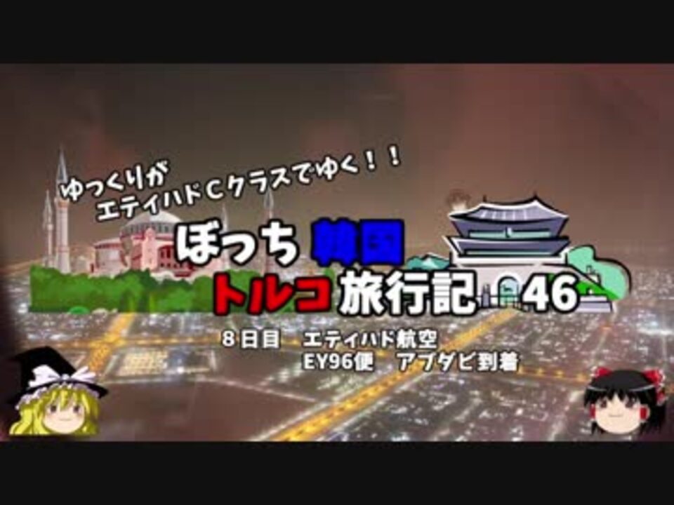 <span style="color: #ff0000; font-size: medium;"><u>※Youtubeで1話分、先行配信中 </u></span><br><span style="color: #0000ff; font-size: medium;"> <a href="http://www.youtube.com/c/なめこのぼっち旅" target="_blank" rel="noopener nofollow">http://www.youtube.com/c/なめこのぼっち旅</a></span> <br><br><br>快適なシートでした!、美味しい機内食!<br>快適なシートであっという間にアブダビに到着!<br>エティハド航空の本拠地ラウンジを満喫します!<br><br>第1話→<a href="https://www.nicovideo.jp/watch/sm34047420" class="watch">sm34047420</a><br><br>第1章・・・韓国観光編<br> 第2章・・・出発編<br> 第3章・・・トルコ観光編<br> 第4章・・・帰路編<span style="color: #ff0000;">←今ココ<br><br>コミュニティー→co2910020</span><br> twitter→<a href="https://twitter.com/ryontan" target="_blank" rel="noopener nofollow">https://twitter.com/ryontan</a><br><br><a href="https://www.nicovideo.jp/watch/sm34842218" class="watch">sm34842218</a>←前回 <span style="color: #ff0000;">次回 47話→</span><a href="https://www.nicovideo.jp/watch/sm34880743" class="watch">sm34880743</a><br><br>解説・雑談系→<a href="https://www.nicovideo.jp/mylist/63171869" target="_blank" rel="noopener">mylist/63171869</a><br>今作 韓国トルコ旅行記→<a href="https://www.nicovideo.jp/mylist/63654428" target="_blank" rel="noopener">mylist/63654428</a><br>今作 車中泊旅行記→<a href="https://www.nicovideo.jp/mylist/54706524" target="_blank" rel="noopener">mylist/54706524</a><br>前作 久米島(沖縄)旅行記→<a href="https://www.nicovideo.jp/mylist/63059251" target="_blank" rel="noopener">mylist/63059251</a><br>イギリスタイ旅行記→<a href="https://www.nicovideo.jp/mylist/60044833" target="_blank" rel="noopener">mylist/60044833</a><br>クルーズ旅行記→<a href="https://www.nicovideo.jp/mylist/57397685" target="_blank" rel="noopener">mylist/57397685</a><br>ドイツ周遊記→<a href="https://www.nicovideo.jp/mylist/54938346" target="_blank" rel="noopener">mylist/54938346</a><br>北海道旅行記→<a href="https://www.nicovideo.jp/mylist/52618057" target="_blank" rel="noopener">mylist/52618057</a><br>アメリカ横断記→<a href="https://www.nicovideo.jp/mylist/48621785" target="_blank" rel="noopener">mylist/48621785</a><br>イタリア周遊記→<a href="https://www.nicovideo.jp/mylist/45763559" target="_blank" rel="noopener">mylist/45763559</a><br>NY旅行記→<a href="https://www.nicovideo.jp/mylist/44343854" target="_blank" rel="noopener">mylist/44343854</a>