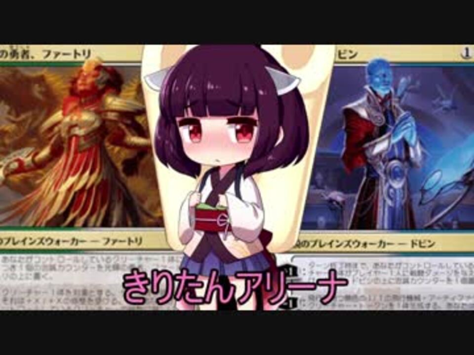 <span style="color: #ff0000; font-size: 24px;">早く次のパック出て欲しい!</span><br>最近デッキのネタが切れたのか全然思いつきません、悲しみ(´・ω・`) まぁラヴニカの2環境で100以上作ったのでよく持ったと言えばよく持ったと思わなくもないですが<br><br>【アリーナ公式。皆アリーナ、しよう!】<br><a href="https://magic.wizards.com/en/mtgarena" target="_blank" rel="noopener nofollow">https://magic.wizards.com/en/mtgarena</a><br><br>【前回の広告者様動画】<br>AHE様:「MTG一人対戦」<a href="https://www.nicovideo.jp/mylist/54219502" target="_blank" rel="noopener">mylist/54219502</a><br>ぐら様:「瞬速のずんだ!」<a href="https://www.nicovideo.jp/mylist/55736658" target="_blank" rel="noopener">mylist/55736658</a><br>ぱ。様:「道東きりたんはMTGアリーナがしたい。」<a href="https://www.nicovideo.jp/mylist/64651491" target="_blank" rel="noopener">mylist/64651491</a><br>ものまねうさぎ様:「初心者でもモダンがしたい!」<a href="https://www.nicovideo.jp/watch/sm32508742" class="watch">sm32508742</a><br>りんこちゃん様:「桜乃そらはガルタがお好き」<a href="https://www.nicovideo.jp/mylist/63726746" target="_blank" rel="noopener">mylist/63726746</a><br>P-Neck様:「東北ずん子のこのデッキは何ですか!」 <a href="https://www.nicovideo.jp/watch/sm32515437" class="watch">sm32515437</a><br>keitama様:「琴葉姉妹が献身ドラフトしながらあーだこーだ」<a href="https://www.nicovideo.jp/watch/sm34530618" class="watch">sm34530618</a><br>ててとら様:「吾輩はMTG動画である。名前はまだ無い。」<a href="https://www.nicovideo.jp/watch/sm33919249" class="watch">sm33919249</a><br>みくにん様:「紲星あかりのゆるマジ」 <a href="https://www.nicovideo.jp/mylist/63517370" target="_blank" rel="noopener">mylist/63517370</a><br>アメジスト様:「東北イタコのMtGA日記」<a href="https://www.nicovideo.jp/mylist/64654534" target="_blank" rel="noopener">mylist/64654534</a><br>レオヴォルド愛好家様:「レオヴォルド好きが□MTGアリーナで遊ぶ」<a href="https://www.nicovideo.jp/watch/sm34155595" class="watch">sm34155595</a><br>konishi様:「【ゆっかりM O】ほろよいマジック」<a href="https://www.nicovideo.jp/mylist/58382838" target="_blank" rel="noopener">mylist/58382838</a><br>とくさん様:「【MTG】結月ゆかりのスタンダード奮闘記」<a href="https://www.nicovideo.jp/mylist/64207519" target="_blank" rel="noopener">mylist/64207519</a><br>ラーメン王様:「結月ゆかりのミラクル解説ラジオ」<a href="https://www.nicovideo.jp/mylist/62359037" target="_blank" rel="noopener">mylist/62359037</a><br>zzz様:「白金決闘者あかり」<a href="https://www.nicovideo.jp/mylist/64686468" target="_blank" rel="noopener">mylist/64686468</a><br>オリヒカ様:「あかりマジック」<a href="https://www.nicovideo.jp/mylist/64945472" target="_blank" rel="noopener">mylist/64945472</a><br><br>【前置きカットリンク】<br>使用デッキ説明まで:<a href="#" class="seekTime" data-seekTime="0:20" onclick="seekNicoPlayer('#0:20'); return false;">#0:20</a><br>試合画面まで:<a href="#" class="seekTime" data-seekTime="3:07" onclick="seekNicoPlayer('#3:07'); return false;">#3:07</a><br><br>【連絡用アドレス】 <br><span style="color: #262626;">kiritanex_2@yahoo.co.jp </span><br>【YouTube】<br>(文字数制限の都合で今回はリンクカット)<br><br><a href="https://www.nicovideo.jp/mylist/63851869" target="_blank" rel="noopener">mylist/63851869</a> 前:<a href="https://www.nicovideo.jp/watch/sm34848836" class="watch">sm34848836</a> 次:<a href="https://www.nicovideo.jp/watch/sm34901956" class="watch">sm34901956</a><br><br>【L O L動画も投稿してます:<a href="https://www.nicovideo.jp/mylist/58624144" target="_blank" rel="noopener">mylist/58624144</a>】<br>