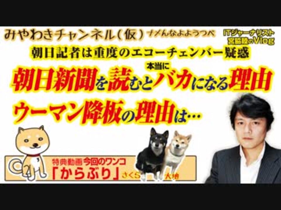 朝日新聞を読むと本当にバカになる理由。朝日記者は重度のエコーチェンバー|みやわきチャンネル(仮)#405Restart263<br><br>0:08 アカが書きヤクザが売ってバカが読む<br>2:55 火のないところに煙を立てる放火魔<br>6:42 朝日にエコーチェンバーの重篤な症状の影<br>10:15 シーマンの降板理由は圧力ではなく実力<br>12:11 アベマ×ニコ動を繋ぐエコーチェンバー<br>14:19 今回のワンコ「不動」<br><br>みやわきチャンネル(仮)#405Restart263<br>(旧・マスコミでは言えないこと)<br>オリジナル2019年3月30日配信<br><br>番組の最後に「柴犬」のコーナーがあります。<br>今回のワンコ「不動」<br><br>■わんこ総集編はこちらから!<br>何かあっても大丈夫、のはず。仮にこの「ワンコチャンネル」になにかあれば・・・オッス、○○と。<br>今回のワンコ総集編〜さくら&大地〜<br><a href="https://www.youtube.com/channel/UChwY..." target="_blank" rel="noopener nofollow">https://www.youtube.com/channel/UChwY...</a><br><br>■ニコニコ動画<br><a href="http://www.nicovideo.jp/user/13610165" target="_blank" rel="noopener nofollow">http://www.nicovideo.jp/user/13610165</a><br>■FRESH LIVE<br><a href="https://freshlive.tv/miyawaki-ch" target="_blank" rel="noopener nofollow">https://freshlive.tv/miyawaki-ch</a><br>■FC2動画<br><a href="https://video.fc2.com/account/16696711" target="_blank" rel="noopener nofollow">https://video.fc2.com/account/16696711</a><br>■YouTube(理不尽に消えることあり)<br><a href="https://www.youtube.com/c/AtsushiMiyawaki" target="_blank" rel="noopener nofollow">https://www.youtube.com/c/AtsushiMiyawaki</a><br><br>■いつ「消える」かわかりません。<br>そこでオフィシャルサイトで「非常用連絡先」をご確認ください。<br>「みやチャン(仮)」公式サイト「MiyawakiNewsNetwork」<br><a href="http://www.miyawakiatsushi.net" target="_blank" rel="noopener nofollow">http://www.miyawakiatsushi.net</a><br><br>■理不尽に消えたとき、以下で情報配信しております。ぜひ、ご登録ください。<br><br>■ツイッター<br><a href="https://twitter.com/miyawakiatsushi" target="_blank" rel="noopener nofollow">https://twitter.com/miyawakiatsushi</a><br>■Facebook<br><a href="https://www.facebook.com/miyawakiatsushi" target="_blank" rel="noopener nofollow">https://www.facebook.com/miyawakiatsushi</a>