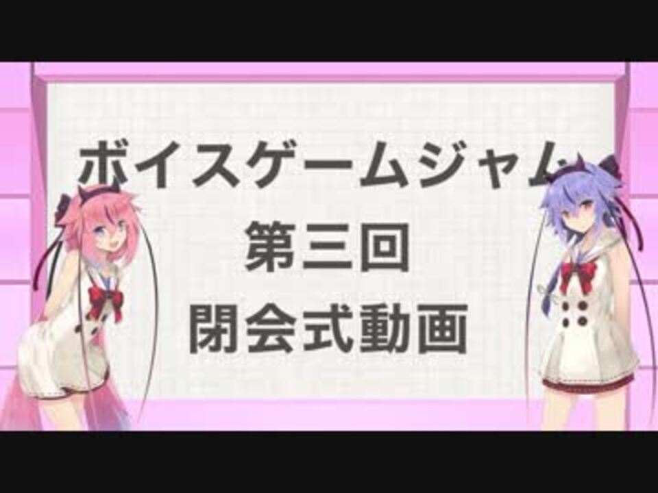 <span style="color: #222222; font-size: 16px;">VOICEROID等(CeVIO等を含めます)を使ったゲームをつくる</span><span style="color: #222222; font-size: 16px;"><strong>ゲームジャム</strong></span><span style="color: #222222; font-size: 16px;">の閉会式動画です!!</span><br><br>今回で三回目のボイゲジャムもついに終了しました!!<br>提出された作品をみんなで見ていきましょう!!<br><br>============================================<br><span style="font-size: 13px;"><strong>イベントページ:</strong></span><a href="https://itch.io/jam/voicegamejam3" target="_blank" rel="noopener nofollow">https://itch.io/jam/voicegamejam3</a><br><span style="font-size: 13px;"><strong>声月</strong></span>:<a href="http://yukari.blueskywings.net/GameTournament.php" target="_blank" rel="noopener nofollow">http://yukari.blueskywings.net/GameTournament.php</a><br><span style="font-size: 13px;"><strong>プレイ会</strong></span>:<a href="https://twipla.jp/events/374661" target="_blank" rel="noopener nofollow">https://twipla.jp/events/374661</a><br><span style="font-size: 13px;"><strong>運営Twitter</strong></span>:<a href="https://twitter.com/voicegamejam" target="_blank" rel="noopener nofollow">https://twitter.com/voicegamejam</a><br>============================================<br><br>第三回マイリス:<a href="https://www.nicovideo.jp/mylist/65040318" target="_blank" rel="noopener">mylist/65040318</a><br><br>プレイはこちらから!!(プレイ会に備えよ)<br><span style="font-size: 13px;">↓</span><br><span style="color: #222222;"><a href="https://itch.io/jam/voicegamejam3/entries" target="_blank" rel="noopener nofollow">https://itch.io/jam/voicegamejam3/entries</a></span>