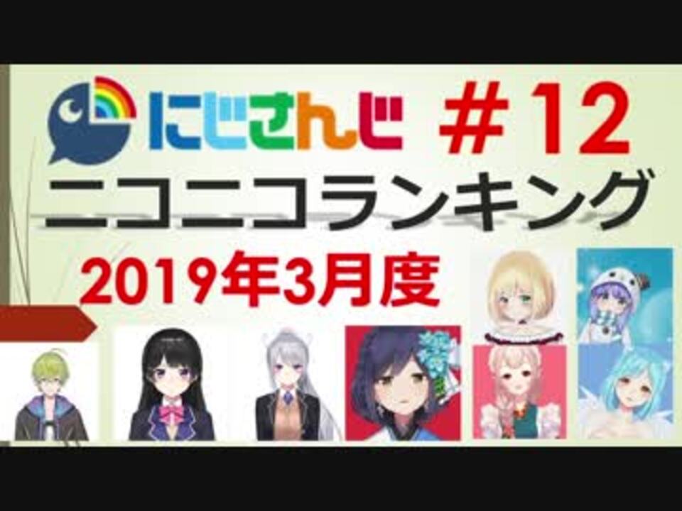 ■集計期間:2019年<span style="color: #ff0000; font-size: 18px;">3月1日</span><span style="color: #262626; font-size: 13px;">0時</span><span style="color: #262626; font-size: 16px;">~</span><span style="color: #ff0000; font-size: 18px;">3月31日</span><span style="font-size: 13px;">24時</span><br>■集計方法:再生数+(コメント数×補正値)+(マイリスト登録数×<span style="color: #ff0000;">25</span><span style="color: #262626;">)</span><br>■集計対象:タグ 「にじさんじ」がついている動画<br>──────<br>プレイリスト:<a href="https://www.nicovideo.jp/mylist/65211592" target="_blank" rel="noopener">mylist/65211592</a><br>──────<br>#08(11月度):<a href="https://www.nicovideo.jp/watch/sm34305609" class="watch">sm34305609</a> | #09(12月度):<a href="https://www.nicovideo.jp/watch/sm34486912" class="watch">sm34486912</a> |<br>#10(1月度):<a href="https://www.nicovideo.jp/watch/sm34596979" class="watch">sm34596979</a><span style="color: #000000; font-size: 13px;"> | #11(2月度):</span><a href="https://www.nicovideo.jp/watch/sm34733577" class="watch">sm34733577</a><span style="color: #000000; font-size: 13px;">|<br>#12(3月度):いまここ | #13(4月度):5月ごろ?|</span><br>年間ランキング:<a href="https://www.nicovideo.jp/watch/sm34419902" class="watch">sm34419902</a><br>──────<br><br>2019年3月度のランキングです。<br><br>このランキングでは<span style="color: #ff0000;"><u>「にじさんじ」のタグが付いている動画のみ</u></span><span style="color: #ff0000;">が集計対象となっています</span>。