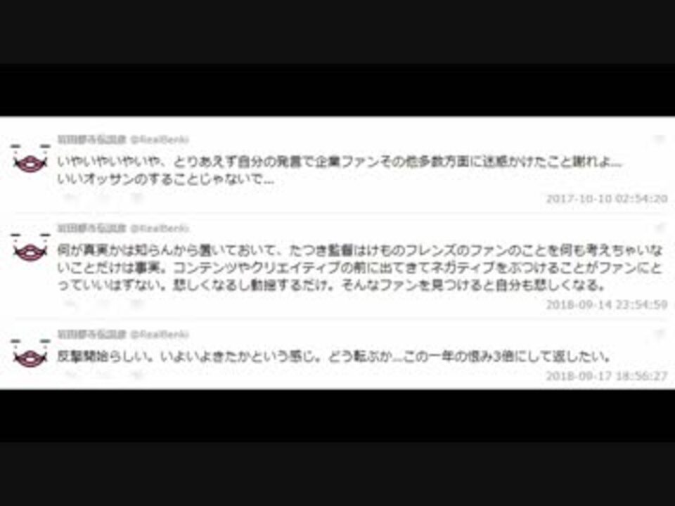 <span style="color: #ff00ff; font-size: 24px;"><strong>5ちゃんより<br>“2018年09月17日 岩田「反撃開始らしい」 <br> 2018年09月18日 ふぁねる垢取得<br> これ完全に答えて合わせじゃん”<br>“ちなみに9月17日の前日の16日は台本盗用問題で最後のたつきツイがあった日な”</strong></span><br><br><br><a href="https://matsuri.5ch.net/test/read.cgi/anime2/1554911502/614-n" target="_blank" rel="noopener nofollow">https://matsuri.5ch.net/test/read.cgi/anime2/1554911502/614-n</a><br><a href="https://matsuri.5ch.net/test/read.cgi/anime2/1554934493/" target="_blank" rel="noopener nofollow">https://matsuri.5ch.net/test/read.cgi/anime2/1554934493/</a><br><br><span style="color: #f1c232; font-size: 24px;"><strong>けものフレンズちゃんねる記事<br><a href="http://kemono-friendsch.com/archives/81669" target="_blank" rel="noopener nofollow">http://kemono-friendsch.com/archives/81669</a></strong></span><br><br><span style="color: #0000ff; font-size: 24px;"><strong>たつき監督発言とぴったり符合した時系列まとめ<br><a href="https://togetter.com/li/1336823" target="_blank" rel="noopener nofollow">https://togetter.com/li/1336823</a></strong></span><br><br><br><span style="color: #ff0000; font-size: 24px;"><strong>@コメ:>こいつのいいね欄を辿ると関係者のたつき叩きが掘れる、そいつらもまとめて魚拓をおススメする</strong></span><br><strong>ありがとうございます。といっても、私は上手くやれるかわからないので、皆様お願いいたします…(頼る)<br>鍵垢にされたが、重要なツイートの魚拓は皆でほぼ全て撮り終えた後ですね</strong><br><span style="font-size: 24px;"><a href="https://twitter.com/RealBenki" target="_blank" rel="noopener nofollow">https://twitter.com/RealBenki</a></span><br><br><br>すでに1つ<br><br><span style="color: #000000;">まぁ見逃し上映会の話は「1」をかばん含め某監督が一人で作ったと思い込んでる人には一生わからん話よな。後ネットの文字面だけじゃその話の真意や流れは伝わらんから次の上映会にいらしてください笑って感じ。好評発売中!(宣伝) <br><br>↑<br>は消されているので、他も急いだ方がいいかも</span>