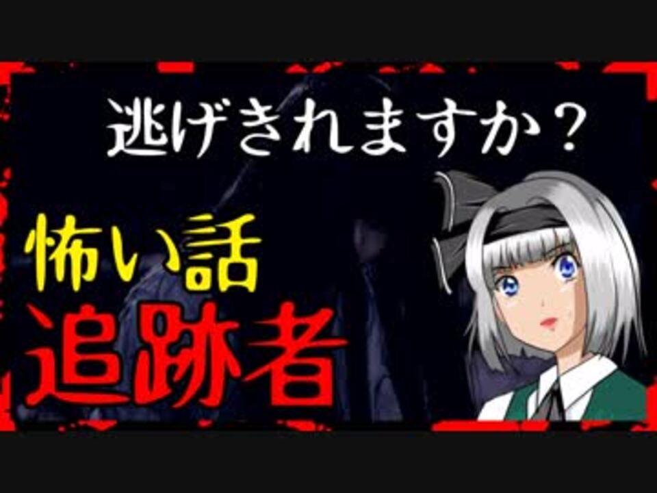 幽霊に追われた事はありますか?とにかく逃げきれない・・・そんな恐怖のどん底に叩き落された体験談です。息を殺して・・・<br><br>前の動画→<a href="https://www.nicovideo.jp/watch/sm34950397" class="watch">sm34950397</a> 天井裏に潜む者<br>噂話でしょう。まとめ→<a href="https://www.nicovideo.jp/mylist/61814339" target="_blank" rel="noopener">mylist/61814339</a><br><br>ゆっくり実況でしょう。の背筋がゾッとする怖い話シリーズです。<br>基本毎週、火曜、金曜、日曜の投稿とさせてもらいます。<br><br><br>ツイッター<br><a href="https://twitter.com/ADprlF1PgQozzmn" target="_blank" rel="noopener nofollow">https://twitter.com/ADprlF1PgQozzmn</a><br><br>いつでもコメントください!<br>皆さんのご意見でチャンネルは成長します!お待ちしてます!<br><br>音楽引用元(フリー音楽 )効果音素材/声:<br>びたちー素材館:<a href="http://www.vita-chi.net/sozai1.htm" target="_blank" rel="noopener nofollow">http://www.vita-chi.net/sozai1.htm</a><br>ポケットサウンド : <a href="https://pocket-se.info/" target="_blank" rel="noopener nofollow">https://pocket-se.info/</a><br>DOVA-SYNDROME :<a href="https://dova-s.jp/" target="_blank" rel="noopener nofollow">https://dova-s.jp/</a><br><br>画像:フリー写真素材:<a href="https://www.pakutaso.com/" target="_blank" rel="noopener nofollow">https://www.pakutaso.com/</a><br>モデル:【緋真煉】【さとうゆい】【河村友歌】<br>カメラマン:【カズキヒロ】 【すしぱく】<br><br><br>動画内容、著作権等に問題がある場合<br>こちらにご連絡いただければ迅速に改善・修正をさせていただきます。<br>何卒よろしくお願い致します。<br>お問い合わせ先:hotarubi119@yahoo.co.jp<br><br>