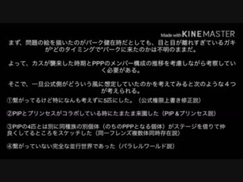 追記・タイトル変更しました。<br><br><span style="color: #ff0000; font-size: 20pt;"><strong>本当なら絶対に許さない <a href="https://www.nicovideo.jp/watch/sm34936672" class="watch">sm34936672</a>←細谷=氷村ふぁねる説</strong></span><br><br>ごめんなさい、メタル/ギアシリーズに対する我慢してた思いが噴出しました。<br><br><br><span style="font-size: 16pt;">あまりにも脱線がひどかったので後日論文風にまとめたものを</span><span style="font-size: 16pt;"><s>再提出します。</s></span><br><span style="font-size: 16pt;">提出しました。次: <a href="https://www.nicovideo.jp/watch/sm34964924" class="watch">sm34964924</a><br><br>前回のコメントの中で「残念ながら、PPP回でクソガキの絵が5人ユニットになってるから、パラレル証明なんだよ、調べてみて」「1と2はパラレルだよ、繋がってたらPPPのスケッチが矛盾する」と言うコメントがあったのでその部分を考察してみました。<br>それにしてもふざけてるのは呪詛を吐いたそばから再び燃料巻いてくるけもフレ2製作陣です。絶対に許さない。<br><br>前の前:<a href="https://www.nicovideo.jp/watch/sm34912251" class="watch">sm34912251</a><br>前:<a href="https://www.nicovideo.jp/watch/sm34936553" class="watch">sm34936553</a><br>次:<a href="https://www.nicovideo.jp/watch/sm34964924" class="watch">sm34964924</a>←上記の再提出動画と同じです。</span>