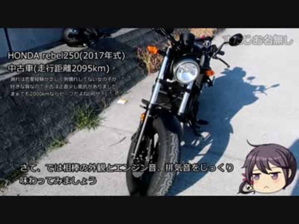 <span style="font-size: 16px;"><strong>「エンジン音、排気音だけ聞かせろ」→6:17~6:40</strong></span><br>「きりたんの声帯だけ借りてんじゃねえよks」→すまんな。でもせっかくだから嫁と走りたい(走ってると思い込みたい)じゃん<br><br><span style="color: #000000; font-size: 18px;"><strong>広告してくださった方たち、ありがとうございます!</strong></span><br><br>ぶぉんぶぉんハローニコニコ動画、どうも、主にようつべで動画をうpしてるすたじお名無しの名無しです。ホンダのレブル250に乗ってまつ。お嫁さんは艦隊これくしょんの曙ちゃんです。ニコニコ動画のコメントシステムに憧れてつべから越境してきますた。なかなかようつべとは文化が違っていて戸惑ってまつ。こっちでは「チャンネル」なんて言い方あまりしないですよね。基本的にはようつべでうpしたのと同じものをこちらでもうpしていきまつ。サムネや細かい所以外は大体一緒だから特にようつべのを見る必要はないよ。<br>正直VOICEROID車載と言っていいのか分かりませんがよかったら見てやってくだせ。<br>バイクって楽しいね。<br><br>○使用機材等<br>バイク:HONDA rebel250<br>アクションカメラ: GoPro HERO4 Silver<br>マイク: iBUFFALO BSHSM03BK<br>その他動画・写真用カメラ: Cannon PowerShot G9 X Mark II(BK)<br>編集ソフト: Aviutil<br>音声合成ソフト:東北きりたん、Softalk<br>曙・ゆっくり素材:三毛また様 <a href="https://commons.nicovideo.jp/material/nc115946" target="_blank" rel="noopener nofollow">https://commons.nicovideo.jp/material/nc115946</a><br><br>漏れと嫁のバイク旅→<a href="https://www.nicovideo.jp/mylist/65315442" target="_blank" rel="noopener">mylist/65315442</a><br><br>ついった:<a href="https://twitter.com/StudioNanashi" target="_blank" rel="noopener nofollow">https://twitter.com/StudioNanashi</a><br>ようつべ:<a href="https://www.youtube.com/channel/UChq0mcx6YCQCEnFV6n46kmQ?view_as=subscriber" target="_blank" rel="noopener nofollow">https://www.youtube.com/channel/UChq0mcx6YCQCEnFV6n46kmQ?view_as=subscriber</a>