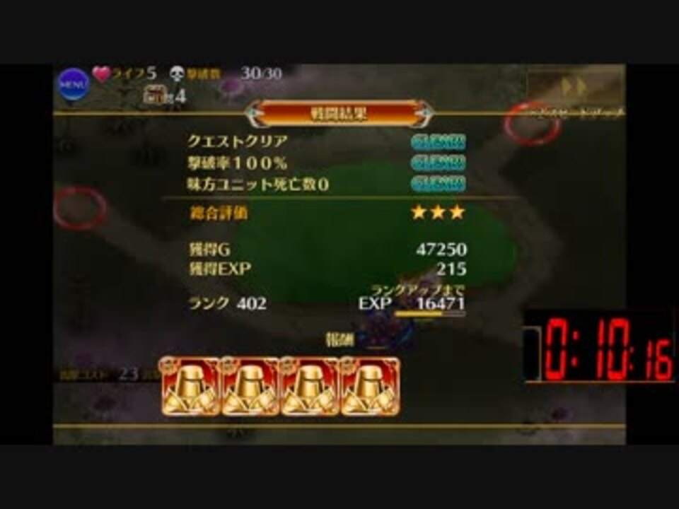 黄金の鎧 神級で敵が潜る前の殲滅<span style="color: #000000; font-size: 13px;">を更新してきました</span><br><br>ミッション開始後、ユニットが表示されて操作可能になった瞬間に計測開始<br>敵の全滅後、ユニットの表示が消えたら計測完了です<br><br>前回の動画で孫堅2人もいないよという声が散見されたので<br><span style="font-size: 13px;">1孫堅で可能なチャートでの再走になります<br>また、倍速しようよというアドバイスも取り入れさせていただきました</span><br><br>最後に王子の置きミスがあったせいでミコトの攻撃1回分遅延が発生<br>偶然青鎧に暗殺が決まったため完走できましたが、ミスがなければ10秒切りも夢ではないはずです<br>みなさん挑戦してみましょう!<br><br>自分の旧記録 17.50><a href="https://www.nicovideo.jp/watch/sm33948794" class="watch">sm33948794</a><br>別走者様の記録 12.20><a href="https://www.nicovideo.jp/watch/sm34869720" class="watch">sm34869720</a><br><br>せっかくなので解説動画も作りました><a href="https://www.nicovideo.jp/watch/sm35068706" class="watch">sm35068706</a><br><br>記録更新しました><a href="https://www.nicovideo.jp/watch/sm35077142" class="watch">sm35077142</a>