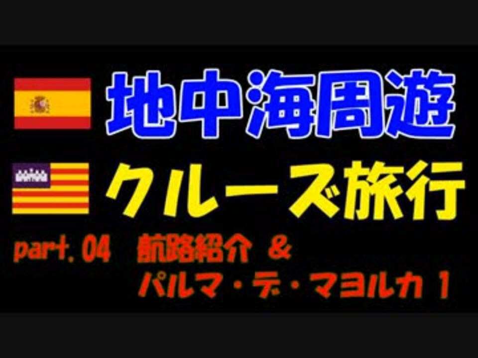旅行3日目(クルーズ2日目)①<br>内容<br>・クルーズ航路の紹介<br>・パルマ・デ・マヨルカ(スペイン)観光①<br>ベルベル城、闘牛場<br>*作中、「船尾にイタリア国旗が掲げられています」と言っていますが、<br>正しくは、国旗ではなくイタリアの「商船旗」でした。<br>三色旗の真ん中に紋章が入っています。国旗には紋章がないですね。<br>ちなみに、この商船旗、メキシコ国旗と似ています。<br> <br>お楽しみ頂ければ幸いです。<br>何かご質問などございましたら、コメント欄にお寄せ下さい。<br> <br><a href="https://www.nicovideo.jp/watch/sm35078282" class="watch">sm35078282</a> ← part.03 / part.05 → <a href="https://www.nicovideo.jp/watch/sm35144441" class="watch">sm35144441</a><br>地中海クルーズ→ <a href="https://www.nicovideo.jp/mylist/65465682" target="_blank" rel="noopener">mylist/65465682</a><br>これまで投稿した動画一覧→<a href="https://www.nicovideo.jp/mylist/56589571" target="_blank" rel="noopener">mylist/56589571</a><br> <br>前作にコメント、マイリス、フォロー、広告くださいました皆様、<br>誠にありがとうございました!<br>