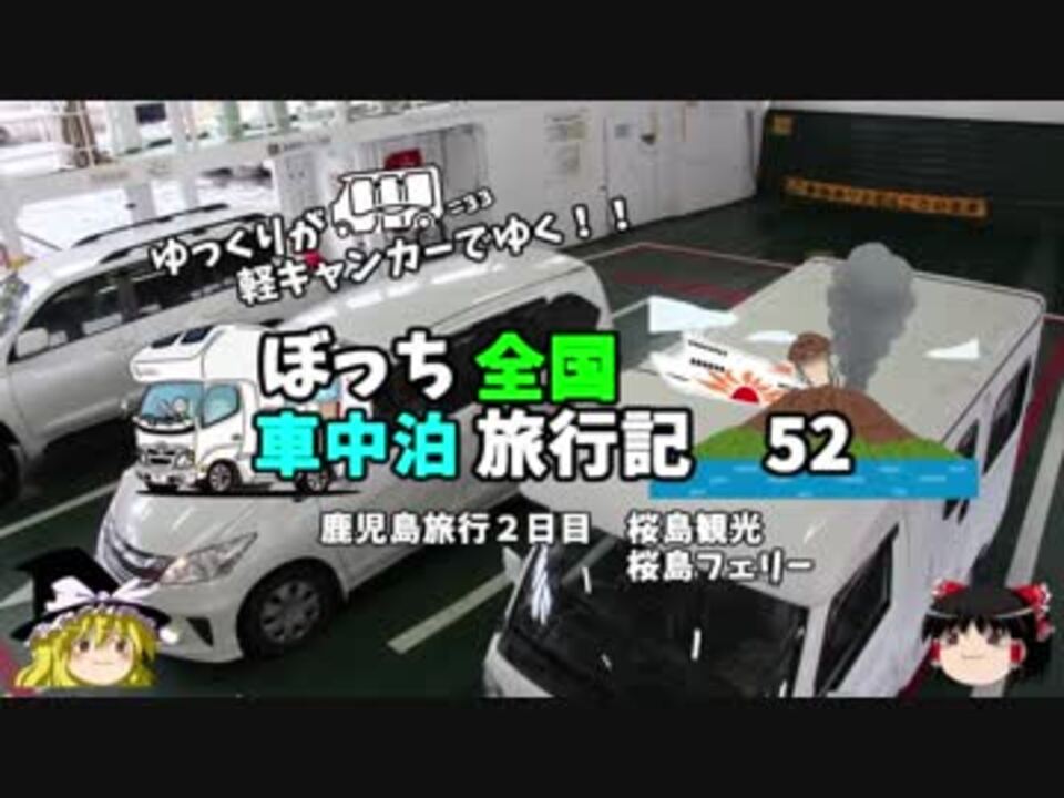 <span style="color: #ff0000; font-size: medium;"><u>※Youtubeで1話分、先行配信中 </u></span><br><span style="color: #0000ff; font-size: medium;"> <a href="http://www.youtube.com/c/なめこのぼっち旅" target="_blank" rel="noopener nofollow">http://www.youtube.com/c/なめこのぼっち旅</a></span> <br><br>桜島も一通り観光し終えたので、<br>フェリーに乗り、鹿児島市内を目指します。!<br><br><span style="color: #ff0000;">コミュニティー→co2910020</span><br> twitter→<a href="https://twitter.com/ryontan" target="_blank" rel="noopener nofollow">https://twitter.com/ryontan</a><br><br><a href="https://www.nicovideo.jp/watch/sm35113066" class="watch">sm35113066</a>←前回 <span style="color: #ff0000;">次回 53話→</span><a href="https://www.nicovideo.jp/watch/sm35172634" class="watch">sm35172634</a><br><br>解説・雑談系→<a href="https://www.nicovideo.jp/mylist/63171869" target="_blank" rel="noopener">mylist/63171869</a><br>今作 韓国トルコ旅行記→<a href="https://www.nicovideo.jp/mylist/63654428" target="_blank" rel="noopener">mylist/63654428</a><br>今作 車中泊旅行記→<a href="https://www.nicovideo.jp/mylist/54706524" target="_blank" rel="noopener">mylist/54706524</a><br>前作 久米島(沖縄)旅行記→<a href="https://www.nicovideo.jp/mylist/63059251" target="_blank" rel="noopener">mylist/63059251</a><br>イギリスタイ旅行記→<a href="https://www.nicovideo.jp/mylist/60044833" target="_blank" rel="noopener">mylist/60044833</a><br>クルーズ旅行記→<a href="https://www.nicovideo.jp/mylist/57397685" target="_blank" rel="noopener">mylist/57397685</a><br>ドイツ周遊記→<a href="https://www.nicovideo.jp/mylist/54938346" target="_blank" rel="noopener">mylist/54938346</a><br>北海道旅行記→<a href="https://www.nicovideo.jp/mylist/52618057" target="_blank" rel="noopener">mylist/52618057</a><br>アメリカ横断記→<a href="https://www.nicovideo.jp/mylist/48621785" target="_blank" rel="noopener">mylist/48621785</a><br>イタリア周遊記→<a href="https://www.nicovideo.jp/mylist/45763559" target="_blank" rel="noopener">mylist/45763559</a><br>NY旅行記→<a href="https://www.nicovideo.jp/mylist/44343854" target="_blank" rel="noopener">mylist/44343854</a>