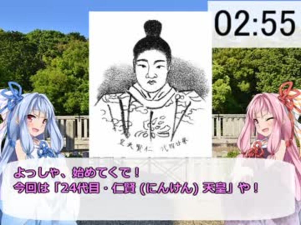 お久しぶりです。令和もよろしくお願いいたします。<br><br>●仁賢 (にんけん)天皇 基本プロフィール <br> 父 市辺押磐皇子 (履中天皇皇子) 母 葛城<span style="color: #262626;">荑媛</span><strong> </strong>(葛城蟻臣娘) <br> 在位 488年?~ 498年? (11年間?)<br> 生涯 449年?~ 498年? (50歳?)<br><br>●1代目 神武天皇 → <a href="https://www.nicovideo.jp/watch/sm33459779" class="watch">sm33459779</a> <br> 23代目 顕宗天皇 → <a href="https://www.nicovideo.jp/watch/sm35020222" class="watch">sm35020222</a> 25代目 武烈天皇 → <a href="https://www.nicovideo.jp/watch/sm35176279" class="watch">sm35176279</a> <br>●3分天皇紹介リスト → <a href="https://www.nicovideo.jp/mylist/62530271" target="_blank" rel="noopener">mylist/62530271</a> ついったー @inocchi_0515<br> 質問箱 → <a href="https://peing.net/ja/inocchi_0515?event=7" target="_blank" rel="noopener nofollow">https://peing.net/ja/inocchi_0515?event=7</a>