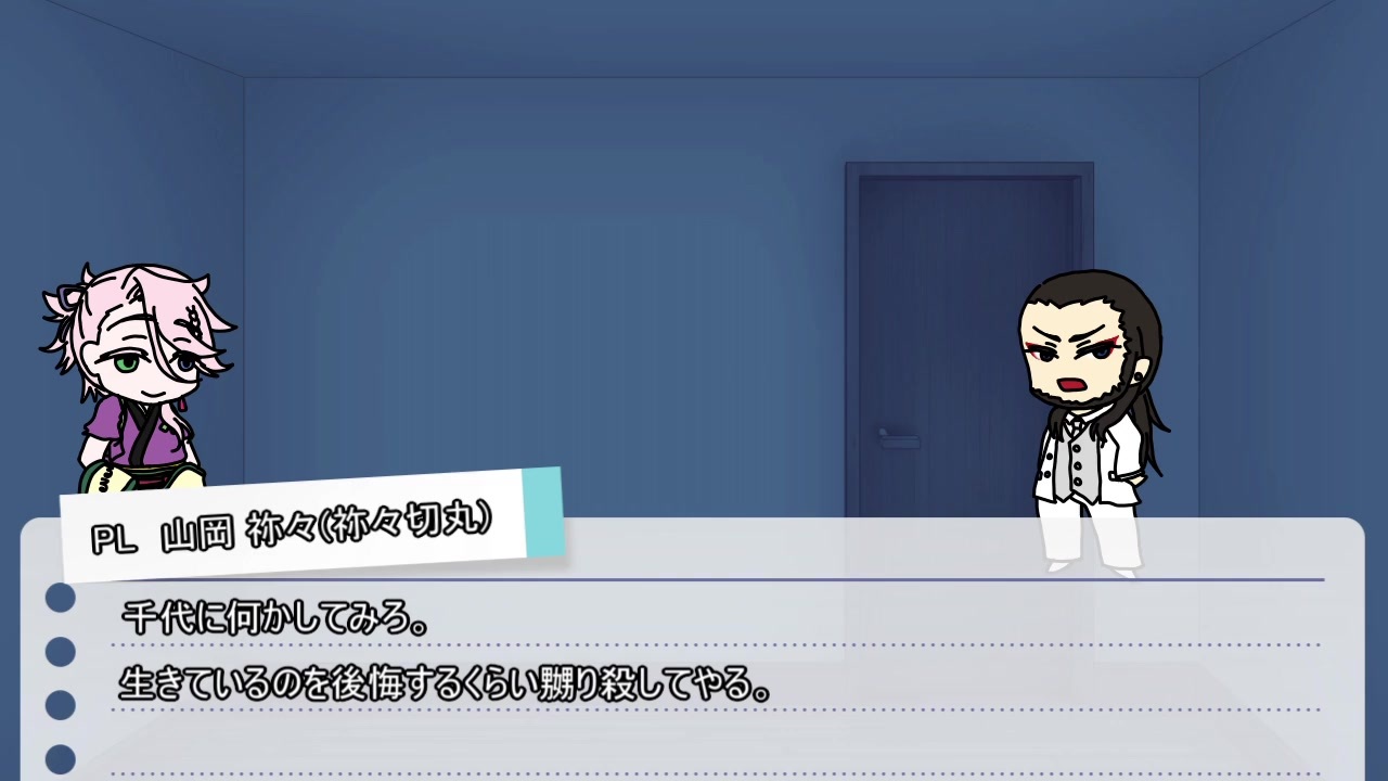 <span style="color: #000000; font-size: 14px;">おまけが色々と悲惨…。<br><br>千代金丸の人→うp主。祢々専クリファンブラー。<br>祢々切丸の人→神話生物を仕留めたい脳筋。<br>白山吉光の人→高INTクリティカラー。</span><br><span style="color: #000000; font-size: 13px;">千子村正の人→</span><span style="color: #000000; font-size: 14px;">RP大好きファンブラー。</span><br><span style="color: #000000; font-size: 13px;">宗三左文字の人→初KP。推理ゲーム好きの切れ者。</span><br><br><a href="https://www.nicovideo.jp/watch/sm35159353" class="watch">sm35159353</a><span style="color: #000000; font-size: 14px;">←前回(part2)|今回(ヌマボコpart3)|次回(最終話)→</span><a href="https://www.nicovideo.jp/watch/sm35172495" class="watch">sm35172495</a><br><br><span style="color: #000000;">パニックミラクル卓マイリスト→</span><span style="color: #006699; font-size: 14px;"><a href="https://www.nicovideo.jp/mylist/65102544" target="_blank" rel="noopener">mylist/65102544</a></span><br><br><span style="color: #000000; font-size: 14px;">Twitter→</span><span style="color: #006699; font-size: 14px;"><a href="https://twitter.com/okujou_livehous" target="_blank" rel="noopener nofollow">https://twitter.com/okujou_livehous</a></span><br><br><span style="color: #000000; font-size: 14px;">お借りしたシナリオ<br>DAISUKE様</span><span style="color: #000000; font-size: 13px;">作成シナリオ</span><br><span style="color: #006699; font-size: 14px;"><a href="https://www.pixiv.net/novel/show.php?id=10445018" target="_blank" rel="noopener nofollow">https://www.pixiv.net/novel/show.php?id=10445018</a></span><br><br><span style="color: #000000; font-size: 14px;">お借りした素材<br>ニコニ・コモンズより。</span>