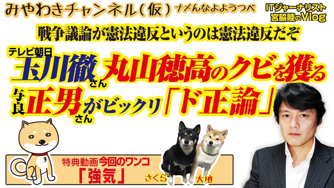 テレビ朝日社員・玉川徹さんが丸山穂高を憲法違反で懲戒だ!<br>ビックリ与良正男さんの「ド正論」。<br>戦争議論が憲法違反というのは憲法違反だぞ。<br><br>0:24 丸山議員を追い詰めたい人々の傲慢<br>3:00 国会議員の身分が守られている理由は<br>5:38 丸山議員の「クビ」を憲法で奪う論理矛盾<br>7:43 国会議員が「戦争」を議論するのは当然<br>11:09 実にわかりやすい「人脈」と「主張」<br>14:50 今回のワンコ「強気」<br><br>みやわきチャンネル(仮)#461Restart319<br>(旧・マスコミでは言えないこと)<br>オリジナル2019年5月24日配信<br><br>番組の最後に「柴犬」のコーナーがあります。<br>今回のワンコ「強気」<br><br>■わんこ総集編はこちらから!<br>何かあっても大丈夫、のはず。仮にこの「ワンコチャンネル」になにかあれば・・・オッス、○○と。<br>今回のワンコ総集編〜さくら&大地〜<br><a href="https://www.youtube.com/channel/UChwY..." target="_blank" rel="noopener nofollow">https://www.youtube.com/channel/UChwY...</a><br><br>■ニコニコ動画<br><a href="http://www.nicovideo.jp/user/13610165" target="_blank" rel="noopener nofollow">http://www.nicovideo.jp/user/13610165</a><br>■FRESH LIVE<br><a href="https://freshlive.tv/miyawaki-ch" target="_blank" rel="noopener nofollow">https://freshlive.tv/miyawaki-ch</a><br>■FC2動画<br><a href="https://video.fc2.com/account/16696711" target="_blank" rel="noopener nofollow">https://video.fc2.com/account/16696711</a><br>■YouTube(理不尽に消えることあり)<br><a href="https://www.youtube.com/c/AtsushiMiyawaki" target="_blank" rel="noopener nofollow">https://www.youtube.com/c/AtsushiMiyawaki</a><br><br>■いつ「消える」かわかりません。<br>そこでオフィシャルサイトで「非常用連絡先」をご確認ください。<br>「みやチャン(仮)」公式サイト「MiyawakiNewsNetwork」<br><a href="http://www.miyawakiatsushi.net" target="_blank" rel="noopener nofollow">http://www.miyawakiatsushi.net</a><br><br>■理不尽に消えたとき、以下で情報配信しております。ぜひ、ご登録ください。<br><br>■ツイッター<br><a href="https://twitter.com/miyawakiatsushi" target="_blank" rel="noopener nofollow">https://twitter.com/miyawakiatsushi</a><br>■Facebook<br><a href="https://www.facebook.com/miyawakiatsushi" target="_blank" rel="noopener nofollow">https://www.facebook.com/miyawakiatsushi</a>