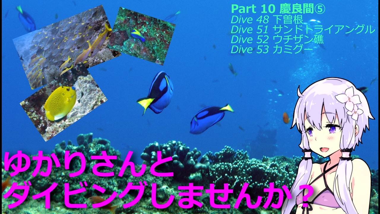 慶良間なんですが、外洋ポイント(初心者お断り)でガッツリ潜ったり出来たので貴重な動画になったと思います。特に下曽根、ウチザン礁は動画自体youtubeでもあまり無いですからね。<br>また、今回のみ、GoPro Hero 7 blackの4K60P動画を使用しています。<br><br>Dive 48 下曽根、Dive 51 サンドトライアングル、Dive 52 ウチザン礁、Dive 53 カミグー<br><br>エコノミー回避向けにyoutube版もあります。→<a href="https://www.youtube.com/watch?v=FhKj4sCoF6o" target="_blank" rel="noopener nofollow">https://www.youtube.com/watch?v=FhKj4sCoF6o</a><br><br>前:<a href="https://www.nicovideo.jp/watch/sm34647178" class="watch">sm34647178</a>(グアム②)<br>次:<a href="https://www.nicovideo.jp/watch/sm35587029" class="watch">sm35587029</a>(奄美)<br>ダイビング動画シリーズ:<a href="https://www.nicovideo.jp/mylist/62144122" target="_blank" rel="noopener">mylist/62144122</a><br><br>撮影機材:Sony RX100M5 + FIX DX1000、GoPro Hero 7 black (オレンジフィルター有り)