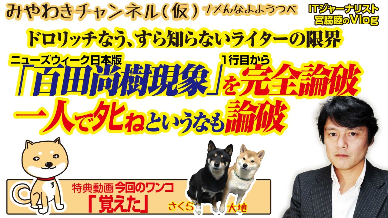 ニューズウィーク日本版「百田尚樹現象」を1行目から完全論破。<br>ドロリッチなうすらしらないライターなら、それが実力だ。。<br>川崎事件の「一人でタヒねというな」も論外。<br><br>0:08 一人でタヒねに反論するブラックバイト論<br>3:26 百田尚樹現象のライター石戸さんとは<br>5:54 目的のある読書には言外の限界がある<br>8:50 「右派」がウハウハなのがビジネスだ<br>12:27 敵と味方で分類する視点に多様性はない<br>14:41 今回のワンコ「覚えた」<br><br>みやわきチャンネル(仮)#466Restart324<br>(旧・マスコミでは言えないこと)<br>オリジナル2019年5月29日配信<br><br>番組の最後に「柴犬」のコーナーがあります。<br>今回のワンコ「覚えた」<br><br>■わんこ総集編はこちらから!<br>何かあっても大丈夫、のはず。仮にこの「ワンコチャンネル」になにかあれば・・・オッス、○○と。<br>今回のワンコ総集編〜さくら&大地〜<br><a href="https://www.youtube.com/channel/UChwY..." target="_blank" rel="noopener nofollow">https://www.youtube.com/channel/UChwY...</a><br><br>■ニコニコ動画<br><a href="http://www.nicovideo.jp/user/13610165" target="_blank" rel="noopener nofollow">http://www.nicovideo.jp/user/13610165</a><br>■FRESH LIVE<br><a href="https://freshlive.tv/miyawaki-ch" target="_blank" rel="noopener nofollow">https://freshlive.tv/miyawaki-ch</a><br>■FC2動画<br><a href="https://video.fc2.com/account/16696711" target="_blank" rel="noopener nofollow">https://video.fc2.com/account/16696711</a><br>■YouTube(理不尽に消えることあり)<br><a href="https://www.youtube.com/c/AtsushiMiyawaki" target="_blank" rel="noopener nofollow">https://www.youtube.com/c/AtsushiMiyawaki</a><br><br>■いつ「消える」かわかりません。<br>そこでオフィシャルサイトで「非常用連絡先」をご確認ください。<br>「みやチャン(仮)」公式サイト「MiyawakiNewsNetwork」<br><a href="http://www.miyawakiatsushi.net" target="_blank" rel="noopener nofollow">http://www.miyawakiatsushi.net</a><br><br>■理不尽に消えたとき、以下で情報配信しております。ぜひ、ご登録ください。<br><br>■ツイッター<br><a href="https://twitter.com/miyawakiatsushi" target="_blank" rel="noopener nofollow">https://twitter.com/miyawakiatsushi</a><br>■Facebook<br><a href="https://www.facebook.com/miyawakiatsushi" target="_blank" rel="noopener nofollow">https://www.facebook.com/miyawakiatsushi</a>