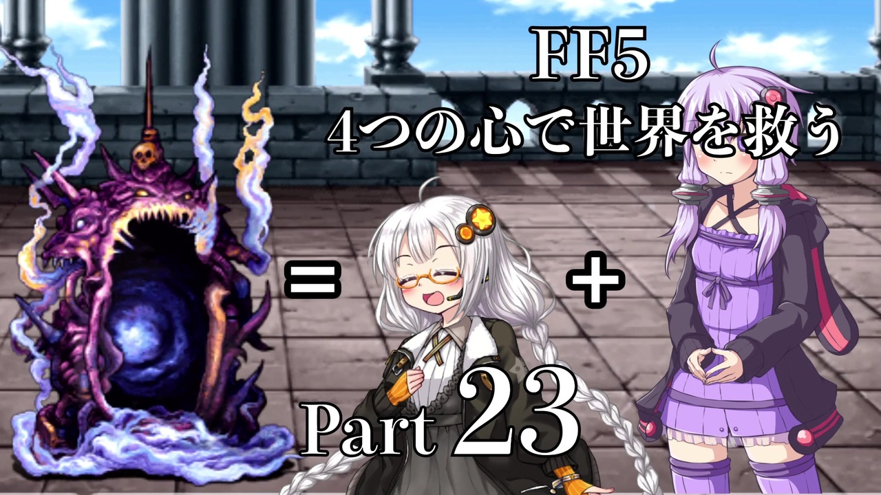 いつもより10%ほど長くしてお送りいたします。<br><br>バッツは風、レナは水、ファリスは火、ガラフは土のクリスタルのかけらしか使えない縛りです。<br>Part 23 はバリアの塔攻略。<br><br><a href="#" class="seekTime" data-seekTime="1:16" onclick="seekNicoPlayer('#1:16'); return false;">#1:16</a> イエロードラゴン×2戦(解説込)<br><a href="#" class="seekTime" data-seekTime="6:02" onclick="seekNicoPlayer('#6:02'); return false;">#6:02</a> レッドドラゴン戦(解説込)<br><a href="#" class="seekTime" data-seekTime="8:28" onclick="seekNicoPlayer('#8:28'); return false;">#8:28</a> アトモス戦(解説込)<br><a href="#" class="seekTime" data-seekTime="16:13" onclick="seekNicoPlayer('#16:13'); return false;">#16:13</a> おまけ(アビリティ紹介)<br><a href="#" class="seekTime" data-seekTime="18:26" onclick="seekNicoPlayer('#18:26'); return false;">#18:26</a> おまけのおまけ(コメント返し)<br><br>市場を埋めてくださる方も密かに募集中です(荒らし防止のためにも)。<br><br><a href="https://www.nicovideo.jp/watch/sm35127125" class="watch">sm35127125</a> ←前 次→ <a href="https://www.nicovideo.jp/watch/sm35252535" class="watch">sm35252535</a><br>Part 1:<a href="https://www.nicovideo.jp/watch/sm33152142" class="watch">sm33152142</a><br>一覧:<a href="https://www.nicovideo.jp/mylist/61912642" target="_blank" rel="noopener">mylist/61912642</a><br>詳しい攻略条件や解説(ブロマガ):<a href="https://ch.nicovideo.jp/article/ar1528756" target="_blank" rel="noopener">ar1528756</a><br>番外編:紲星あかりの初見(風)プレイ「あかりゆかりひかりのせんし」:<a href="https://www.nicovideo.jp/watch/sm33995490" class="watch">sm33995490</a><br><br>コメント返信で紹介した「私の主観で選ぶニコニコFF5縛りプレイ動画三大聖典」<br>3位:FF5 侍プレイ その1 <a href="https://www.nicovideo.jp/watch/sm2915563" class="watch">sm2915563</a><br>2位:FF5を青魔道士の青魔法のみでクリアしてみる1 <a href="https://www.nicovideo.jp/watch/sm1574823" class="watch">sm1574823</a><br>1位:FF5蛙縛り part1 <a href="https://www.nicovideo.jp/watch/sm2792976" class="watch">sm2792976</a><br><br>使用させていただいている主な素材:<br>しのびぃ~様:結月ゆかり立ち絵(<a href="https://seiga.nicovideo.jp/seiga/im5349056" target="_blank" rel="noopener">im5349056</a>)、紲星あかり立ち絵(<a href="https://seiga.nicovideo.jp/seiga/im7682678" target="_blank" rel="noopener">im7682678</a>)<br>華音3R様:紙素材(<a href="https://commons.nicovideo.jp/works/nc155446" target="_blank" rel="noopener">nc155446</a>、<a href="https://commons.nicovideo.jp/works/nc175857" target="_blank" rel="noopener">nc175857</a>)<br>Rebecca Tripp様:Galuf's world <a href="https://rebeccatripp.bandcamp.com/track/galufs-world" target="_blank" rel="noopener nofollow">https://rebeccatripp.bandcamp.com/track/galufs-world</a><br>その他の素材は動画の最後とコンテンツツリーにて紹介。<br>(※素材は切り抜き、色調整、その他の改変を利用規約の範囲内でしている場合があります)<br>